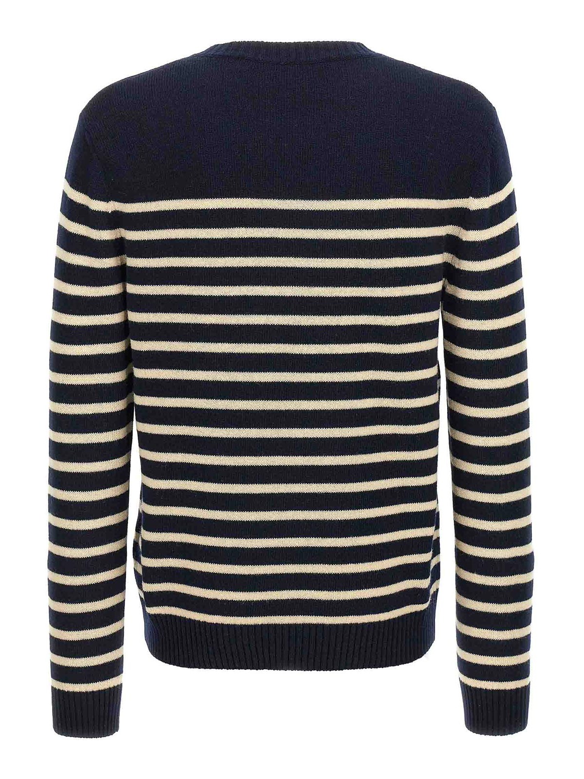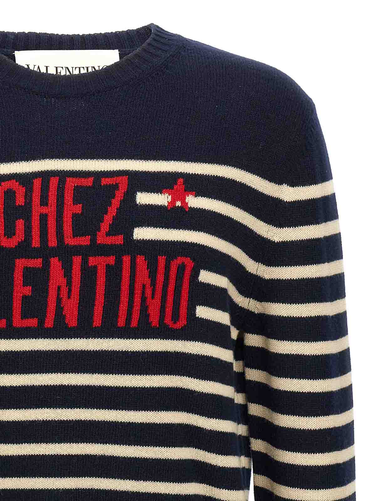 7本のストライプをあしらった上質なウールセーター。前面にジャカード柄の「シェ・ヴァレンティノ」柄、クルーネック、ロングカフスリーブ。