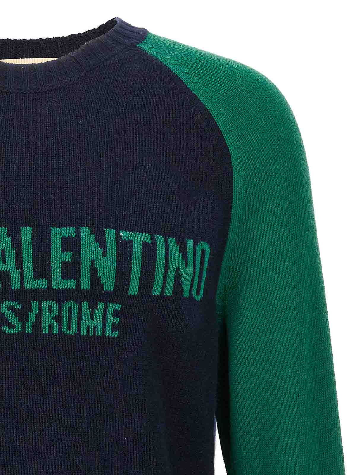 上質なウールとコットンの混紡セーター。前面にジャカードの「シェ・ヴァレンティノ」柄とコントラストの効いたディテールをあしらった、クルーネック、ロングカフスリーブ。