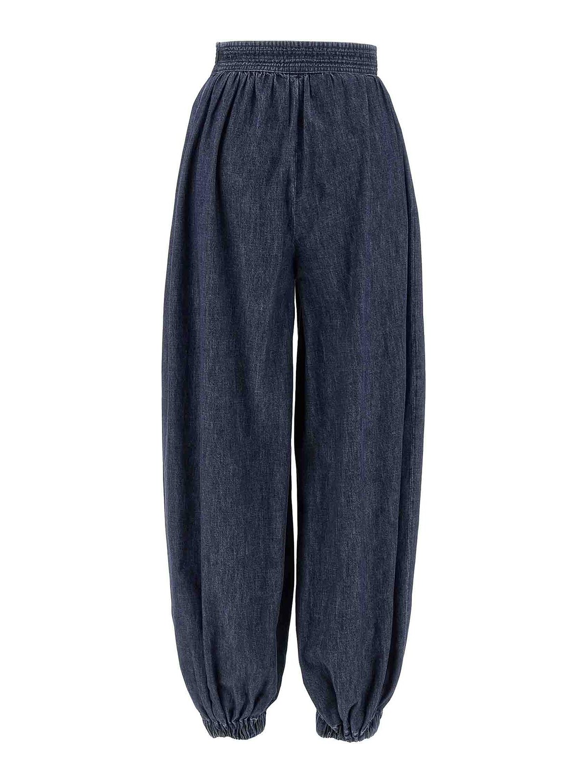 ルーズレッグ、ハイウエスト、プリント生地のパイピングポケット、伸縮性ウエストバンド、伸縮性のあるアンクルカフスのシャンブレーコットンデニムパンツ。