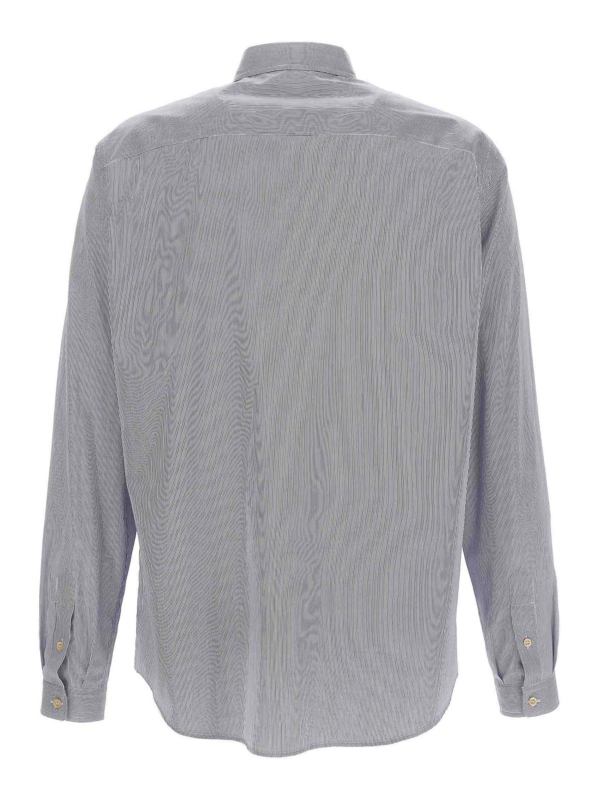ストライプコットンシャツ、襟、フロントボタン留め、ロゴ刺繍入りパッチポケット、ロングカフスリーブ。