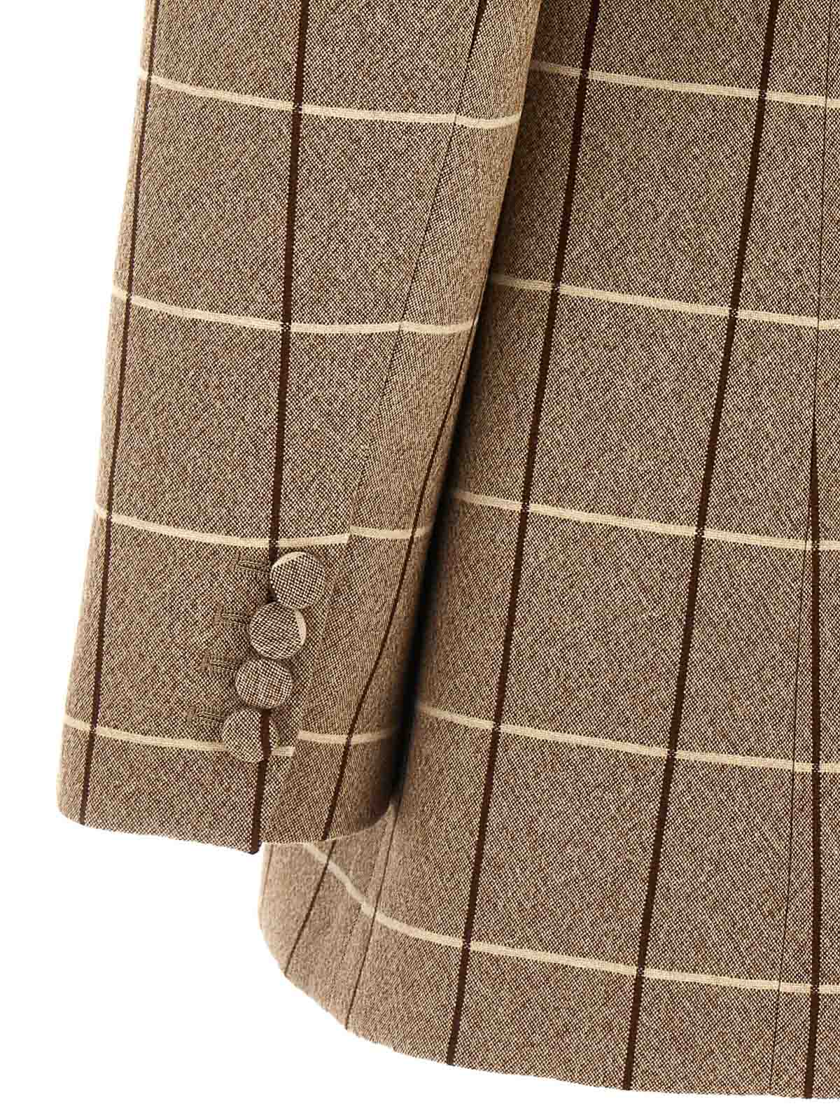ダブルブレストのウールブレザー。フロントボタン留め、ピークラペル、胸ポケット、フラップポケット、パッド入りショルダー、ロングスリーブ、バックスプリット、斜めのラインのクレープデシン裏地付き。