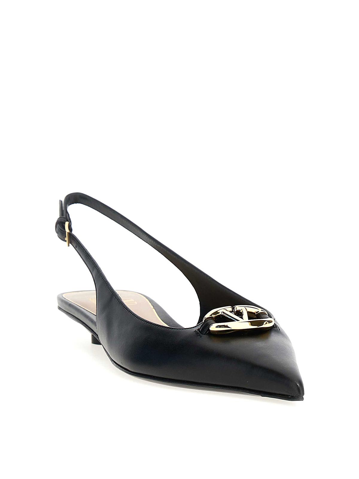 フロントにゴールドメタルの「vlogo the bold edition」アップリケをあしらったレザー製のスリングバックシューズ。調節可能なストラップ付き。