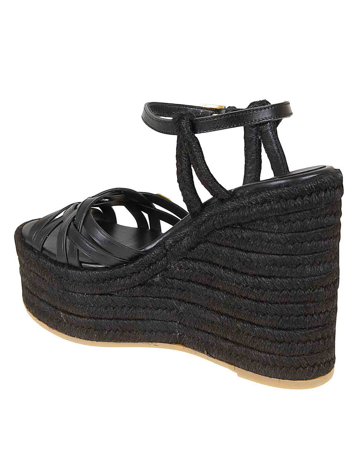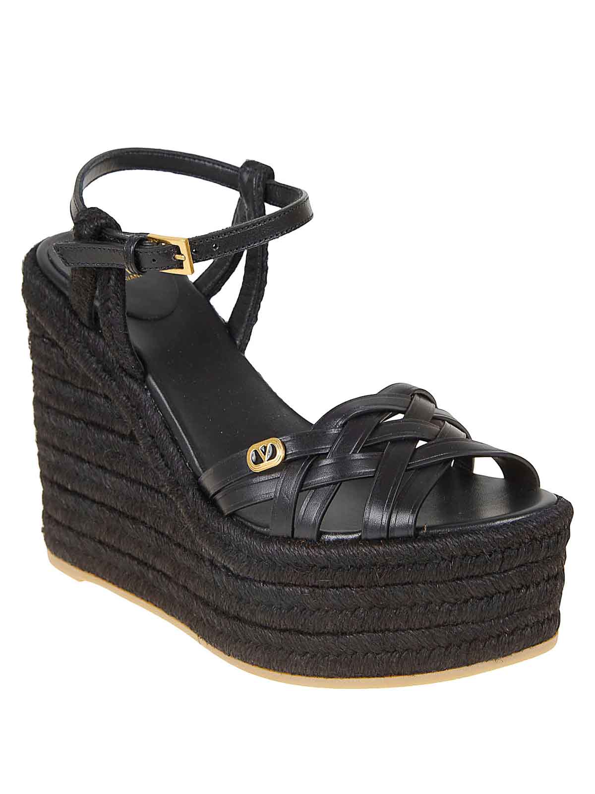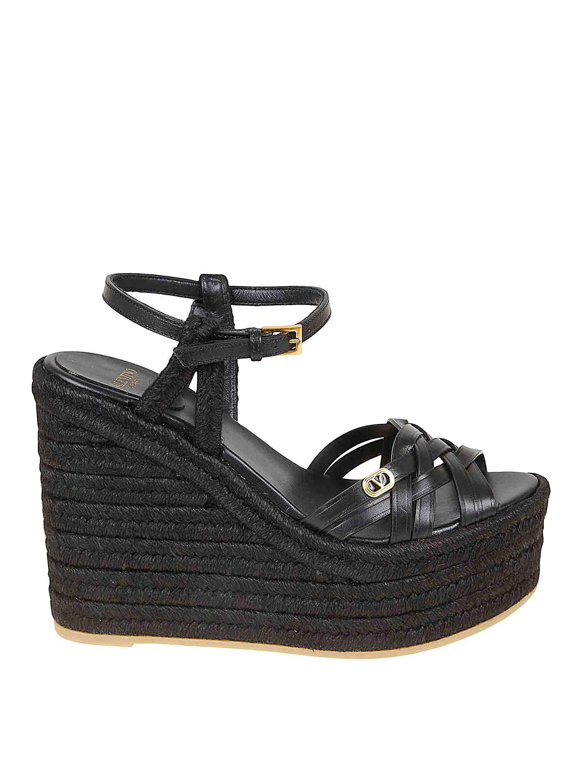 Valentino Garavanのレザーウェッジサンダル。調節可能なアンクルストラップとウーブンバンドが付いており、ウーブンバンドにはシグネチャーのVlogoアクセサリーが付いています