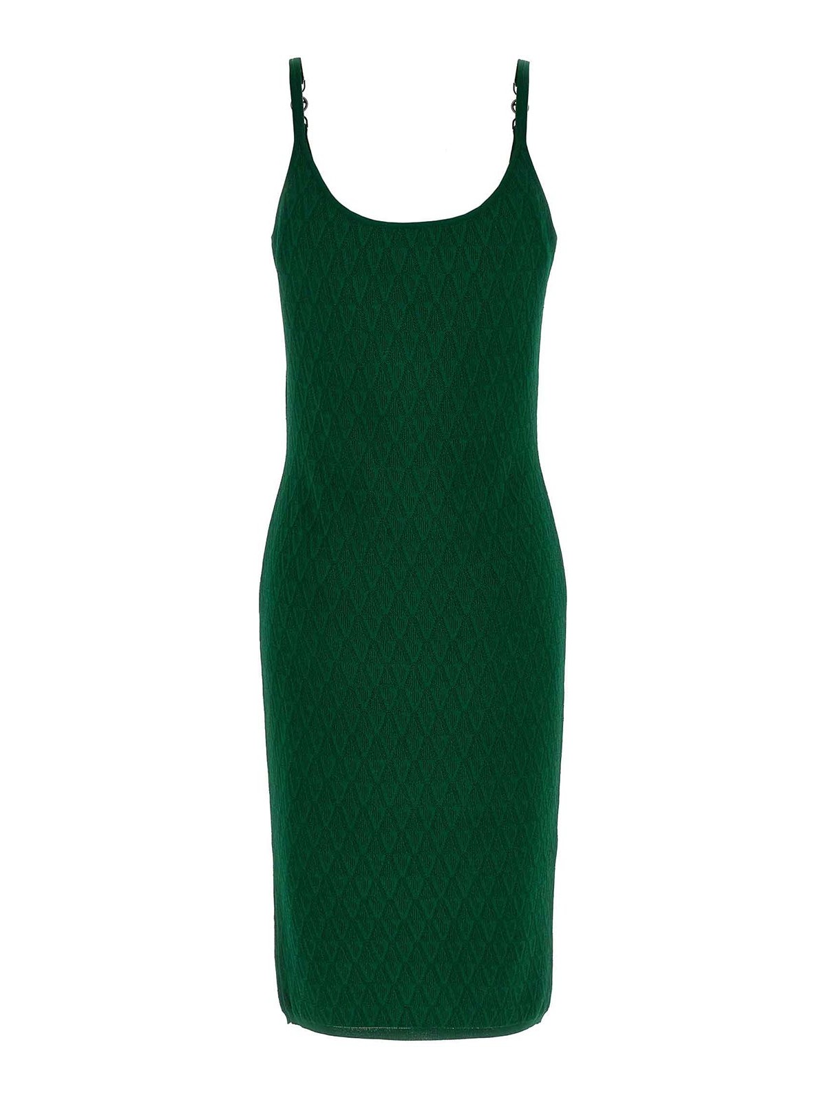 トーン・オン・トーンのジャカードニットで全体にV柄をあしらったストレッチビスコースミディドレス、シースドレス、フロントにメタルの「メドゥーサ '95」のディテールをあしらった細いストラップ、前面と背面に幅広のラウンドネックライン、ノースリーブ。