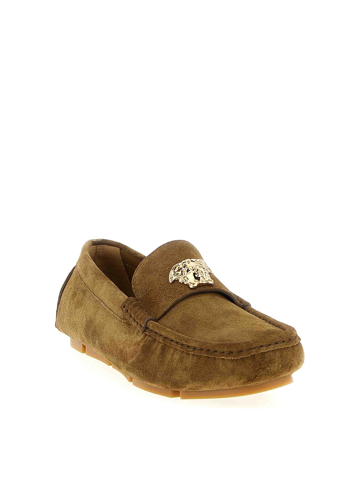フロントメタルの「ラメデューサ」のディテールが施されたドライバーモデルのスエードローファー、ラバーの「グレカ」ソールが付いています。