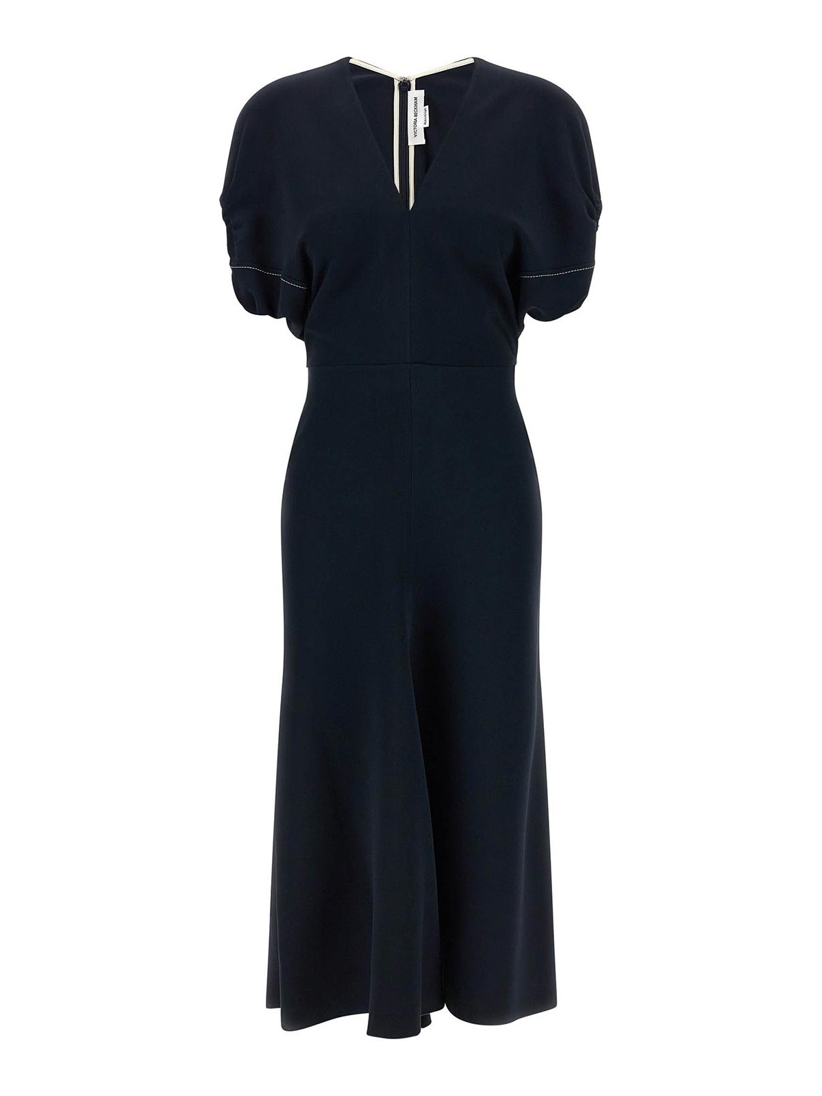 エディスのキャディードレス、コントラストの効いた内側のトリムをあしらったVネック、幅広のブラウススリーブ、バックファスナー、アシンメトリーな長さ。