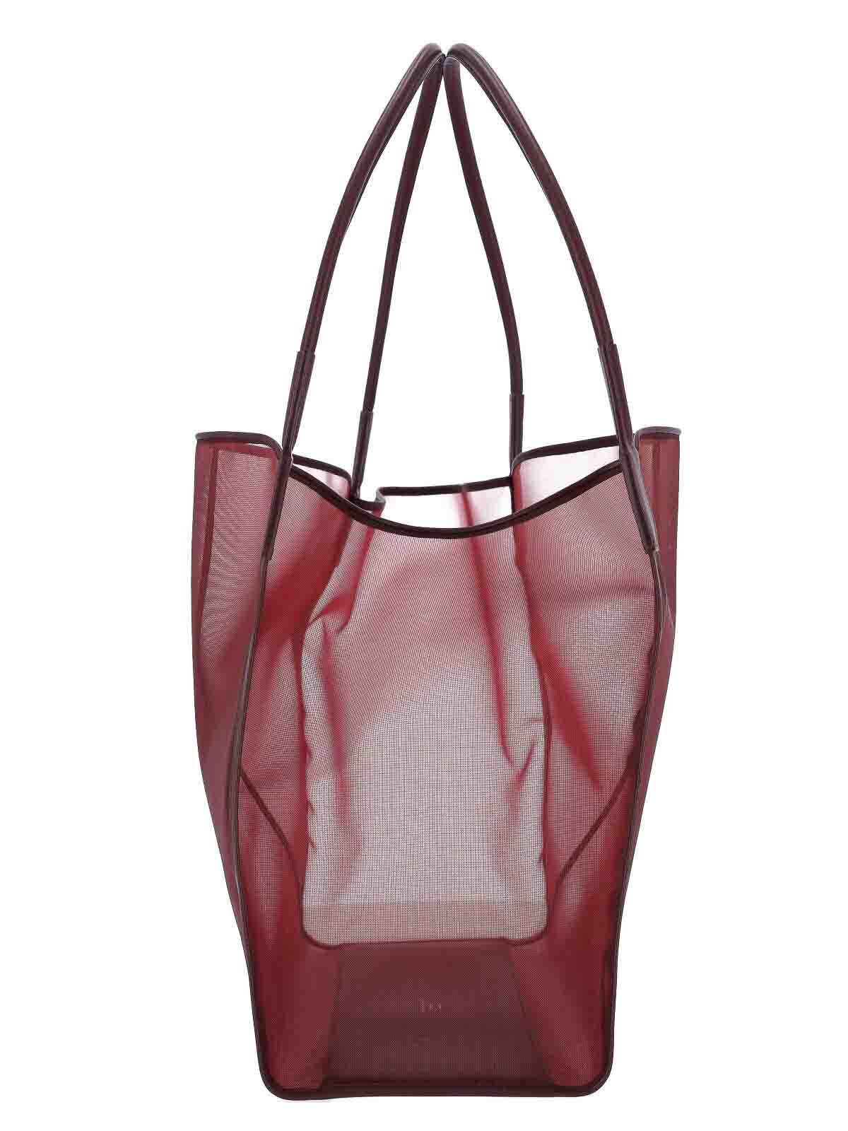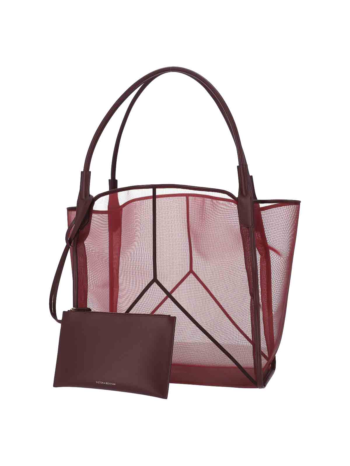 レッドメッシュのVictoria Victoria Beckhamトートバッグ、バーガンディトーン、レザートップハンドル2つ、取り外し可能な内部レザーポーチ、レザー仕上げ、内部コンパートメント1つ。
