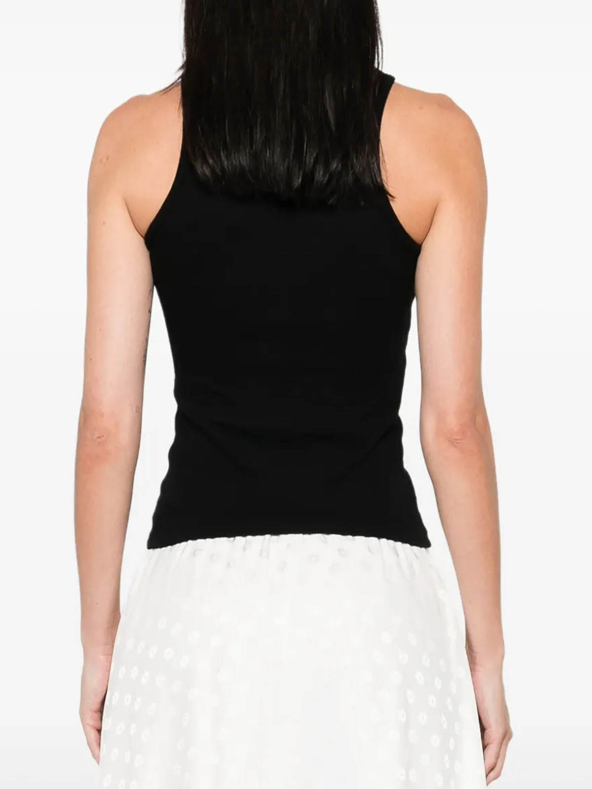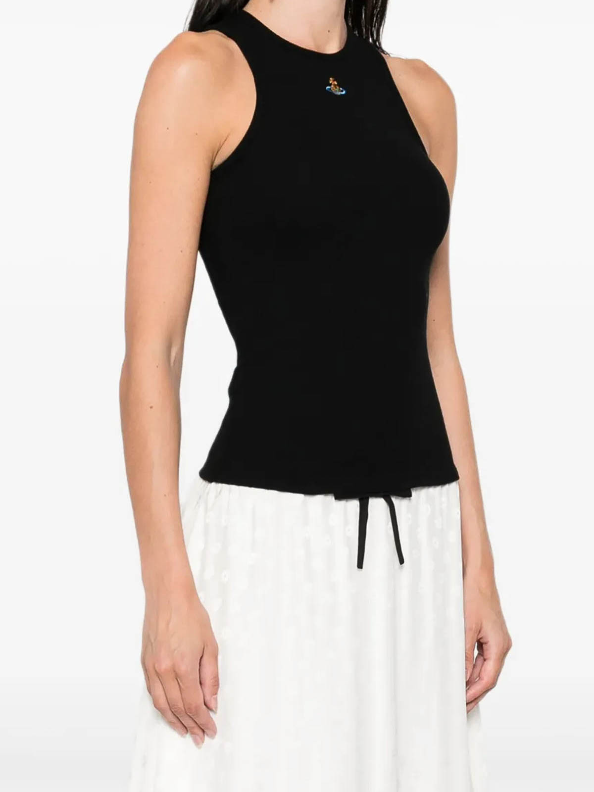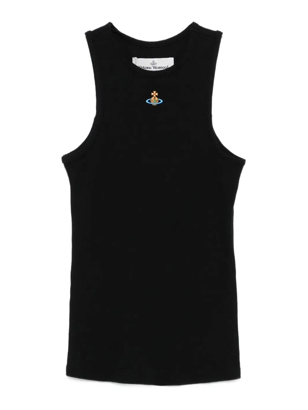 リブニット、ラウンドネック、ノースリーブ、オーブモチーフ。素材:綿95%、イタリア製エラスタン5%