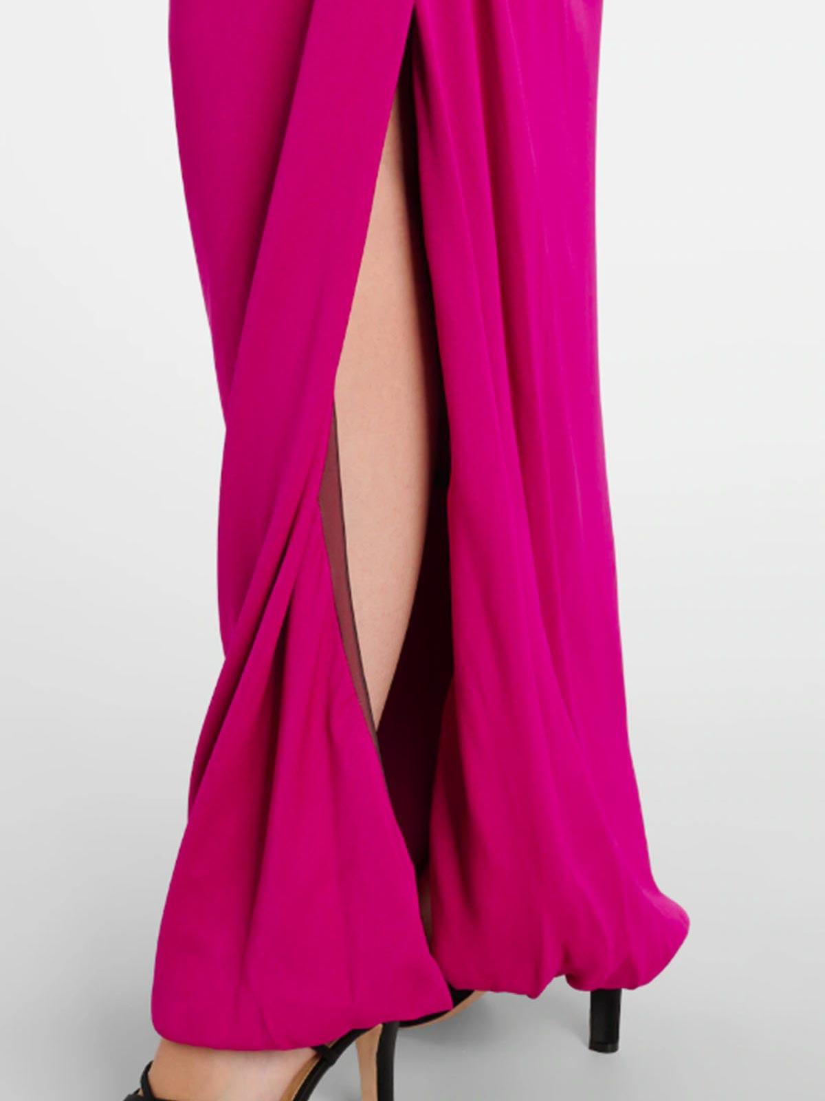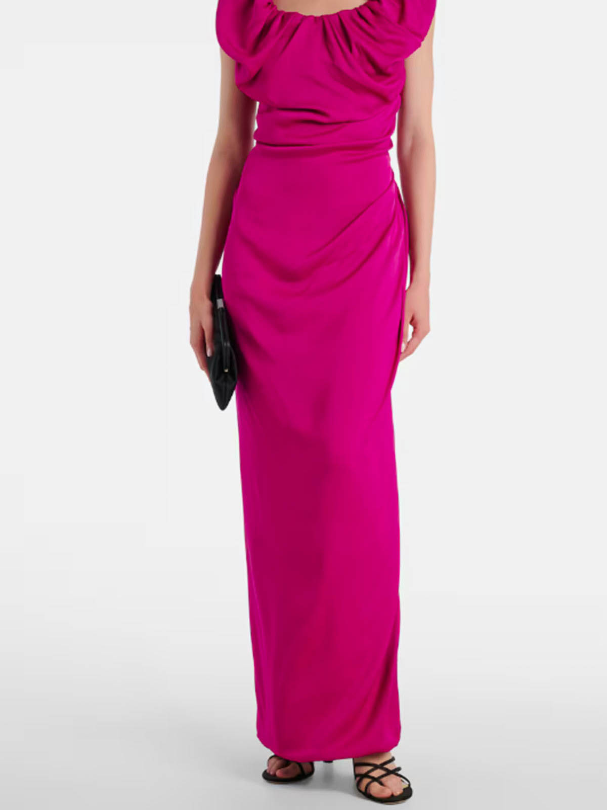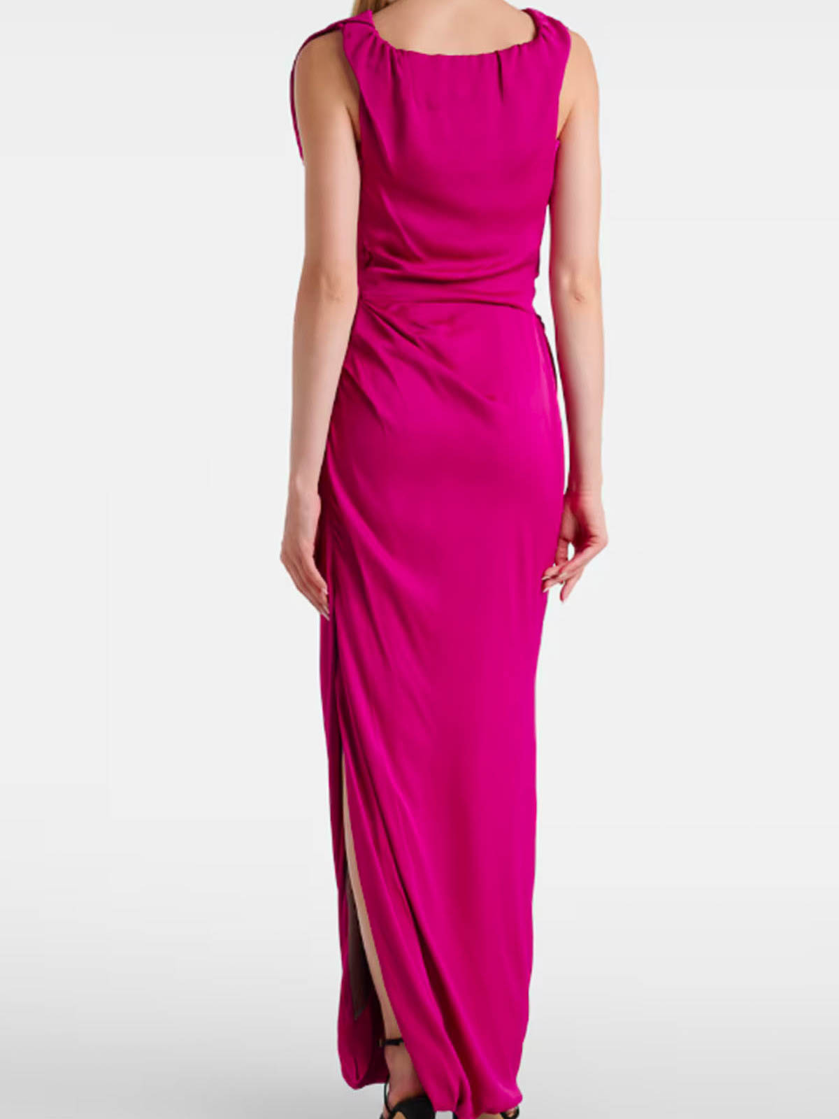 ギャザーネックラインと体型にフィットするエレガントなドレープ、サイドスリット、床まで届くアシンメトリーなヘム、コントラストの効いた裏地、ショルダーストラップ、ノースリーブ、トーンオントーンのステッチ、床までの長さ、隠しサイドジッパーが特徴です。組成 100% ビスコースイタリア製