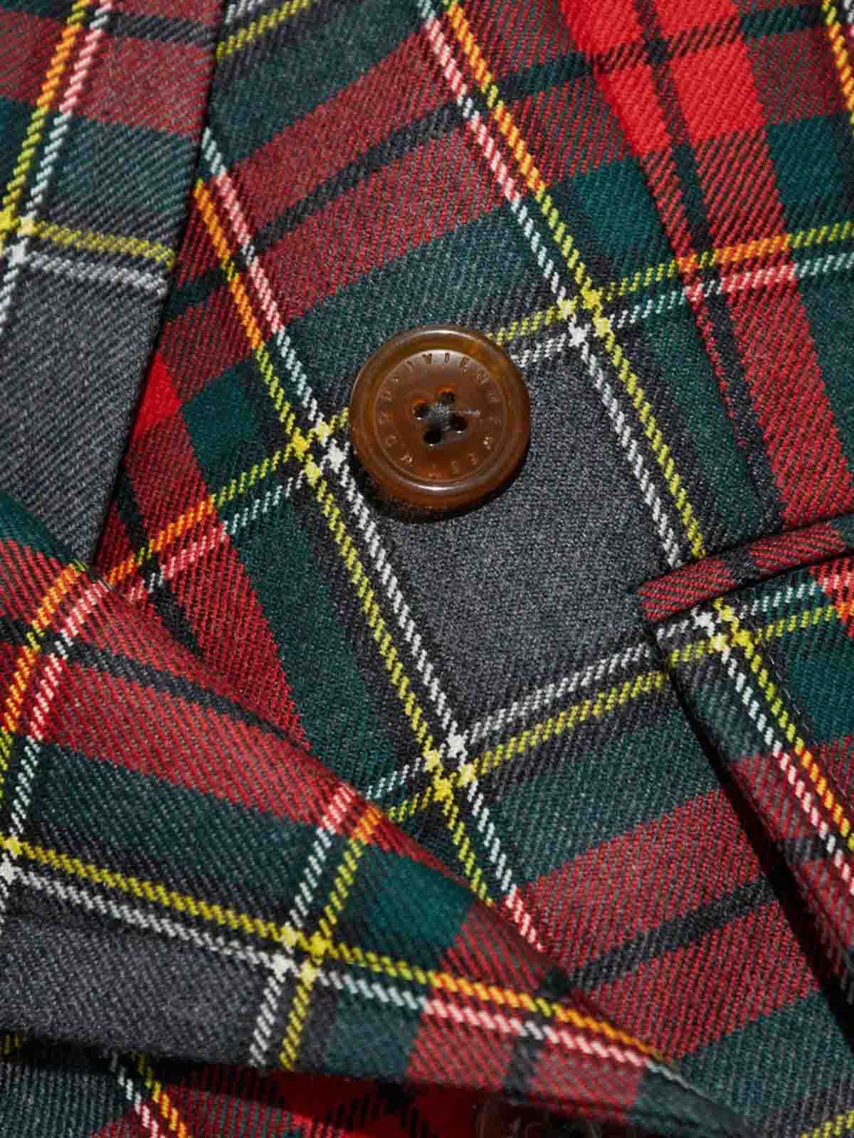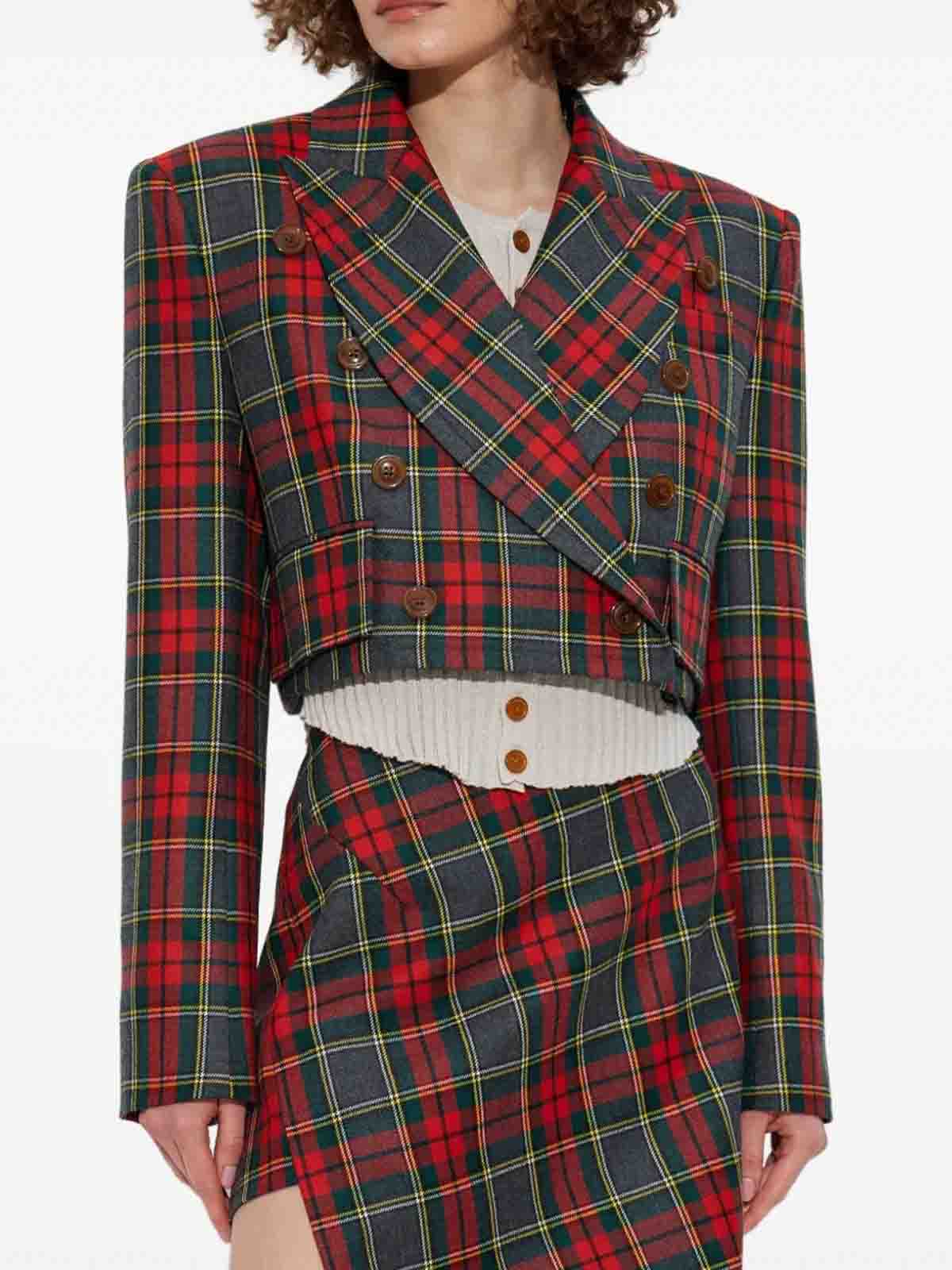 クロップドデザイン、ピークドラペル、ワイドスリーブ、タータン柄、ショルダーパッド、ダブルブレスト。素材 100% イタリア製バージンウール