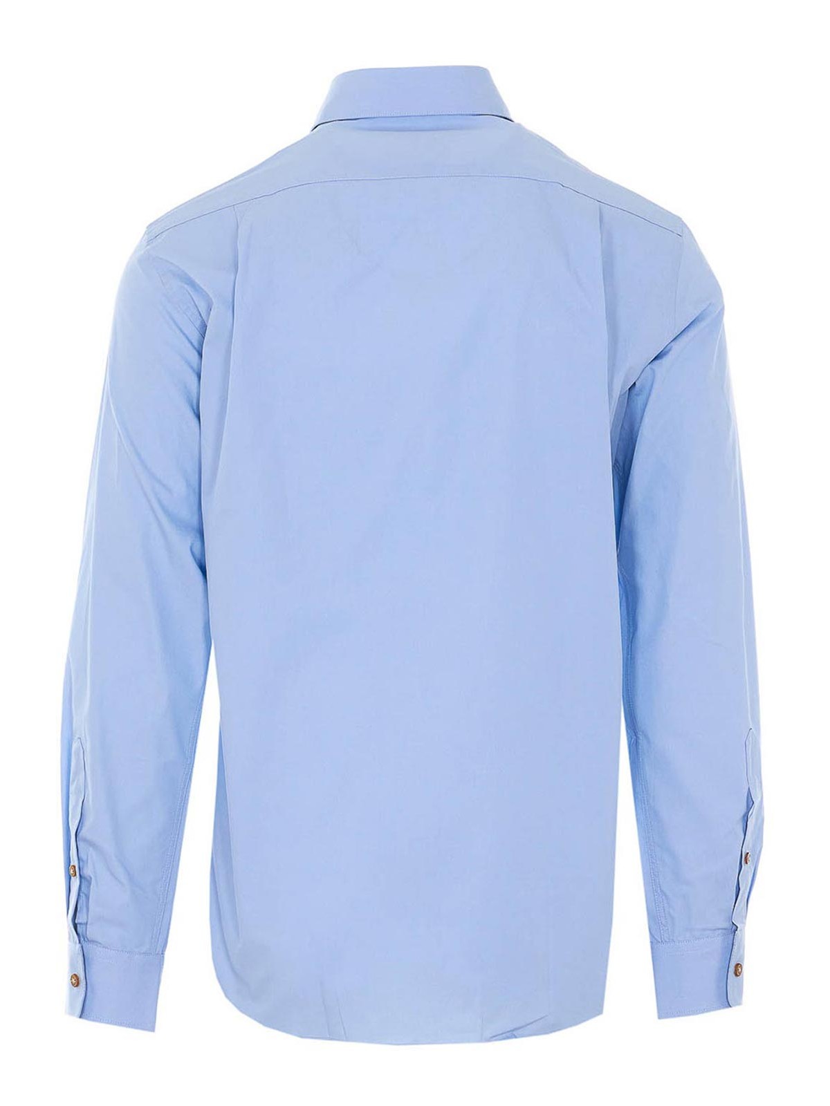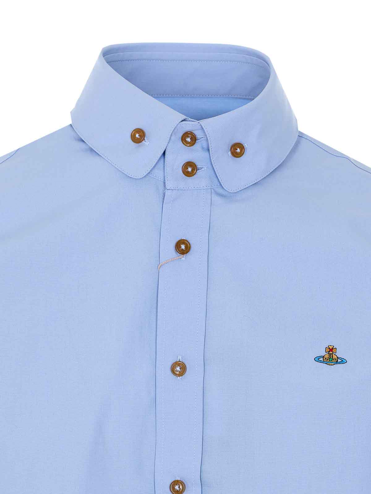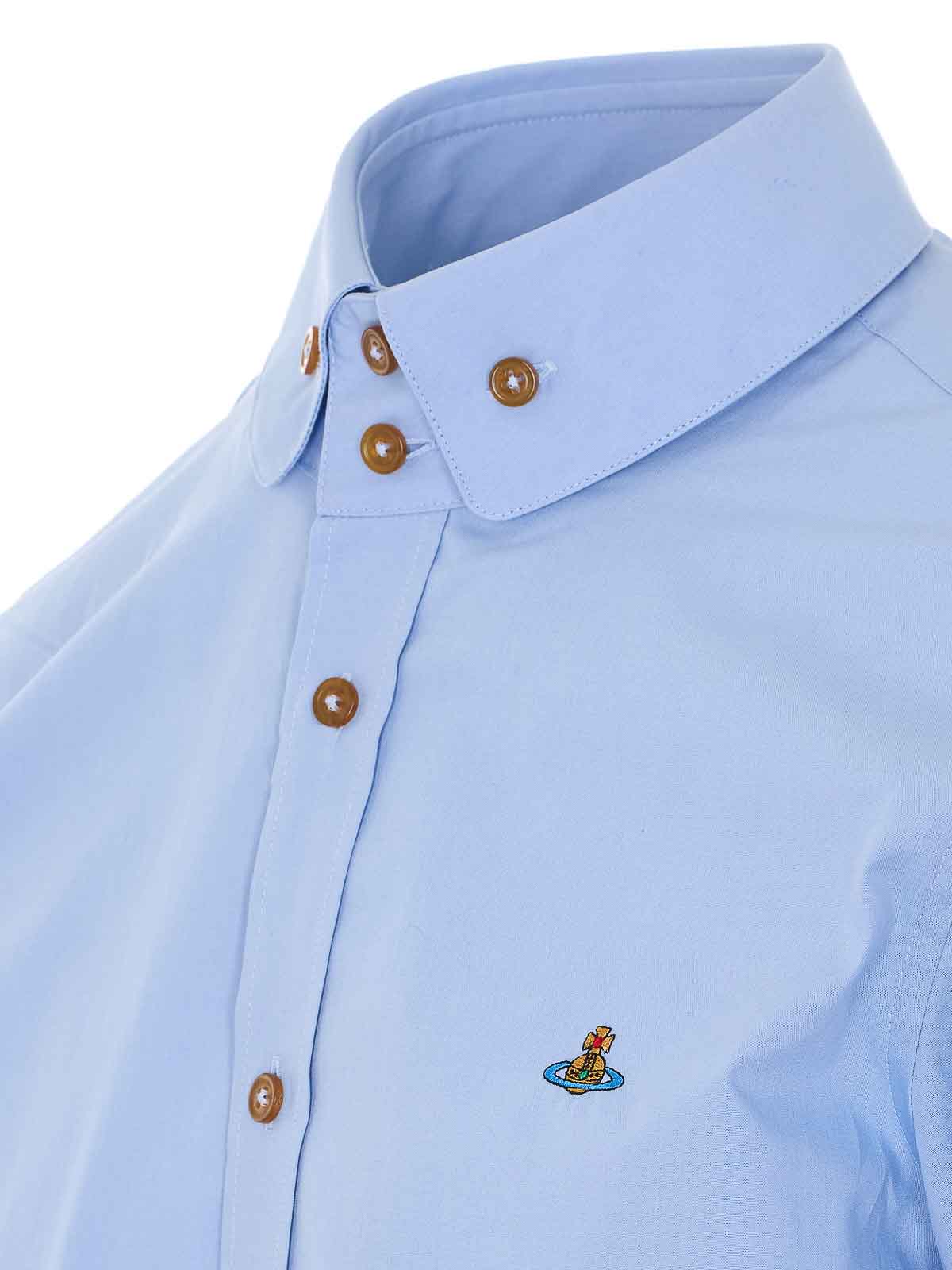 Vivienne westwood ライトブルーのクラールボタンシャツ、フロントボタン留め、レギュラーカラー、ロングスリーブ、カフスにボタン、フロントにオーブのロゴが刺繍されています