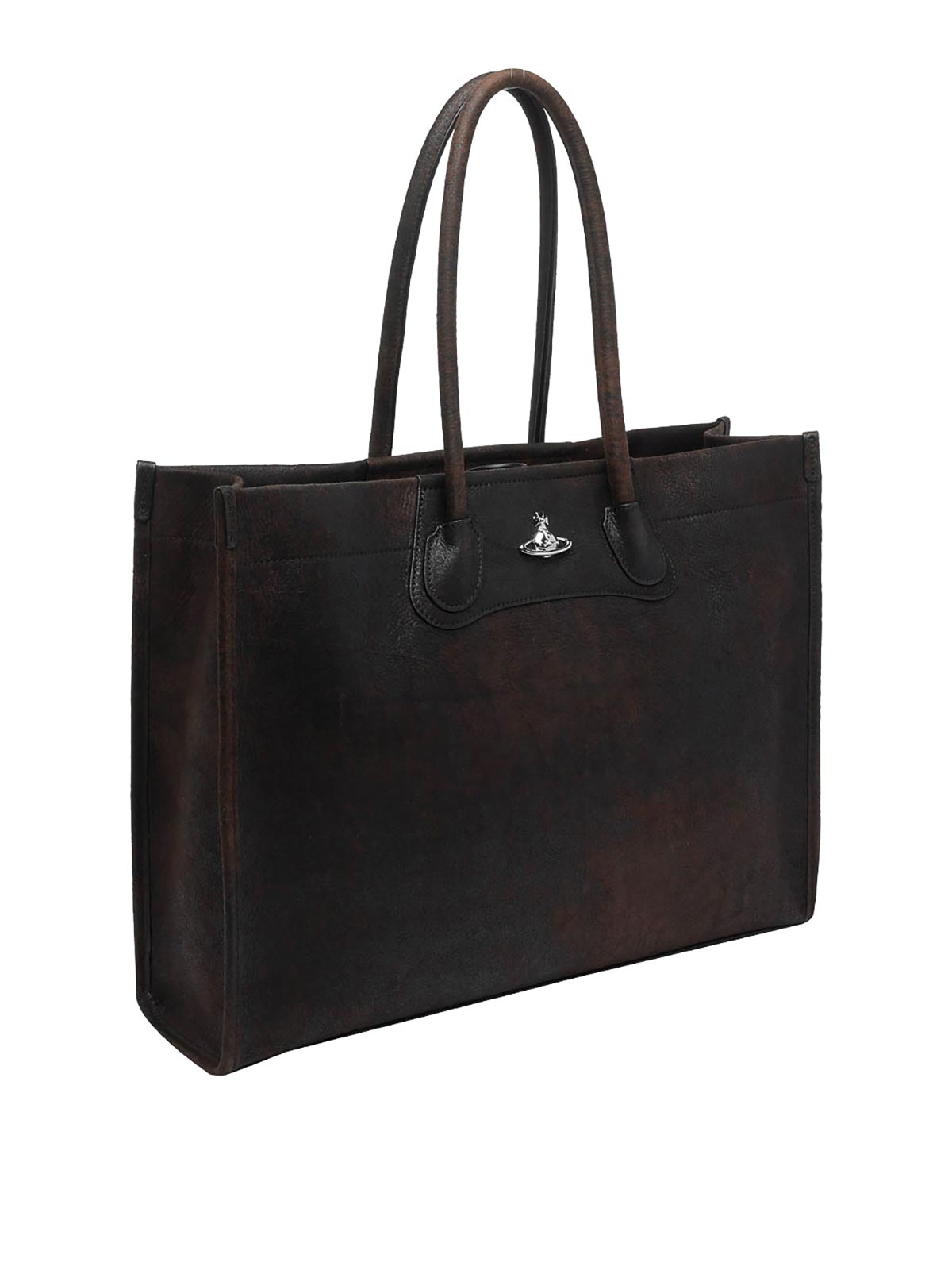 Vivienne westwood ブラックトロイトートバッグ、マグネットクロージャー、ファスナー付きインナーポケット、ショルダーストラップ2本、正面ロゴ
