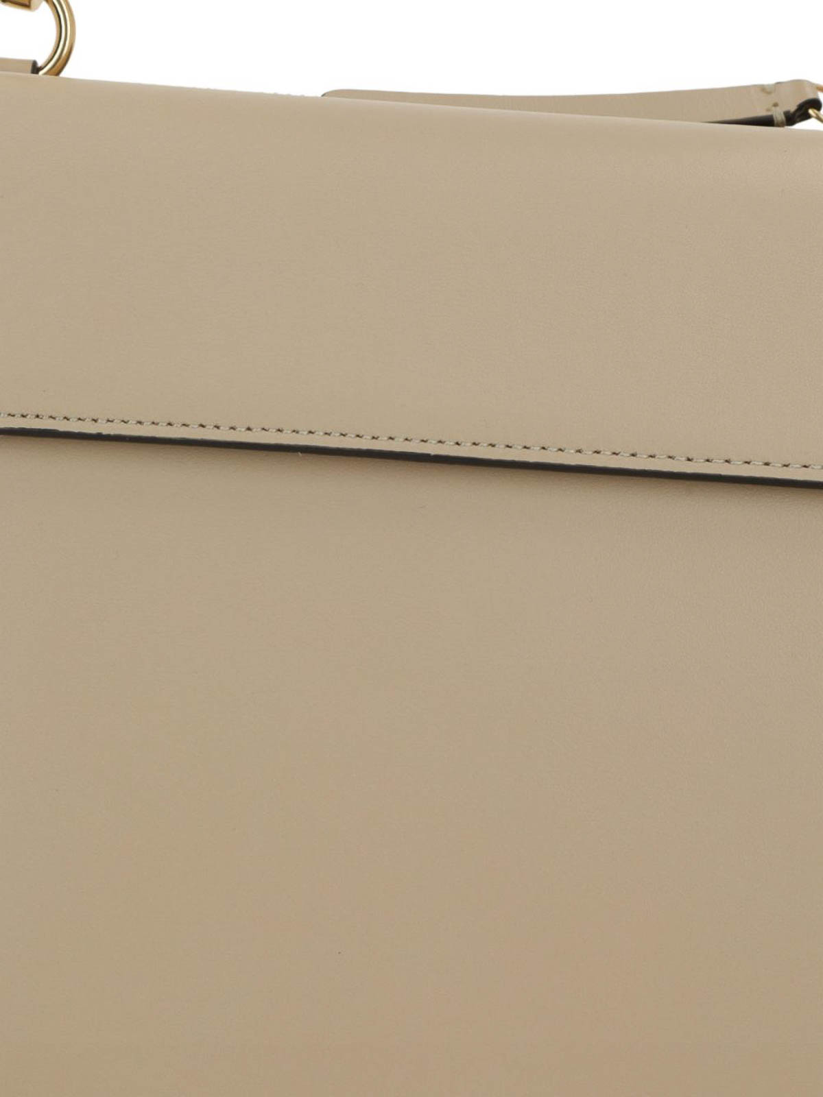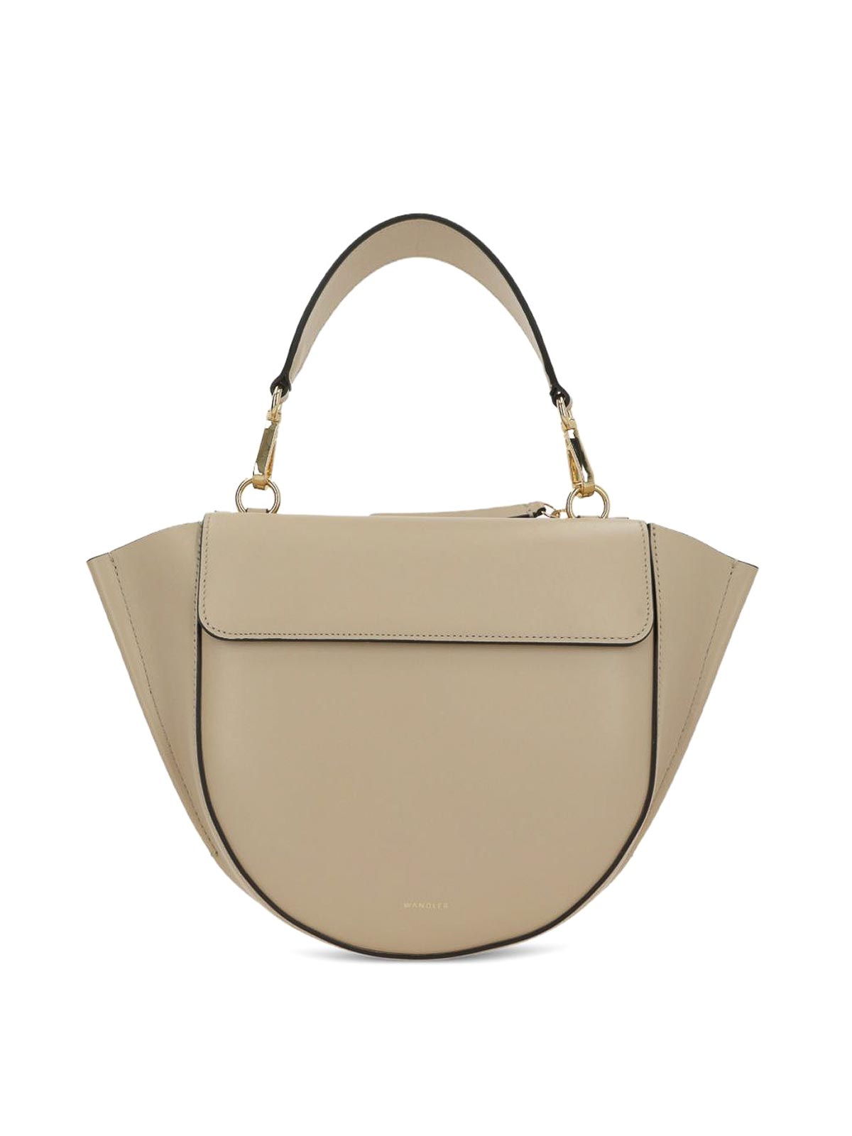 ライトベージュレザーのWandlerのHortensiaスモールトップハンドルバッグは、正面にエンボス加工のロゴとゴールドトーンの金具が特徴です。マグネットフラップクロージャー、取り外し可能なトップハンドル、調節可能で取り外し可能なショルダーストラップが付いており、トーン・オン・トーンの革の裏地が付いた内側にはフラットポケットが付いています。デザインはフラットポケット付きの背面ジッパーコンパートメントによって完成され、洗練され機能的になっています普段使いにも洗練された装いにも合う、多彩なアクセサリーです。