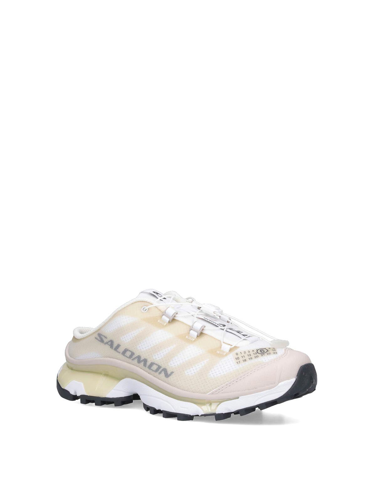 xt-4 mules mm6 maison margiela x salomon スニーカー、ベージュメッシュ、グリーン仕上げ、ラウンドトゥ、数字ロゴディテール、ドローストリングクロージャー、ロゴラベルディテール、サイドロゴプリント、テクスチャードラバーソール。