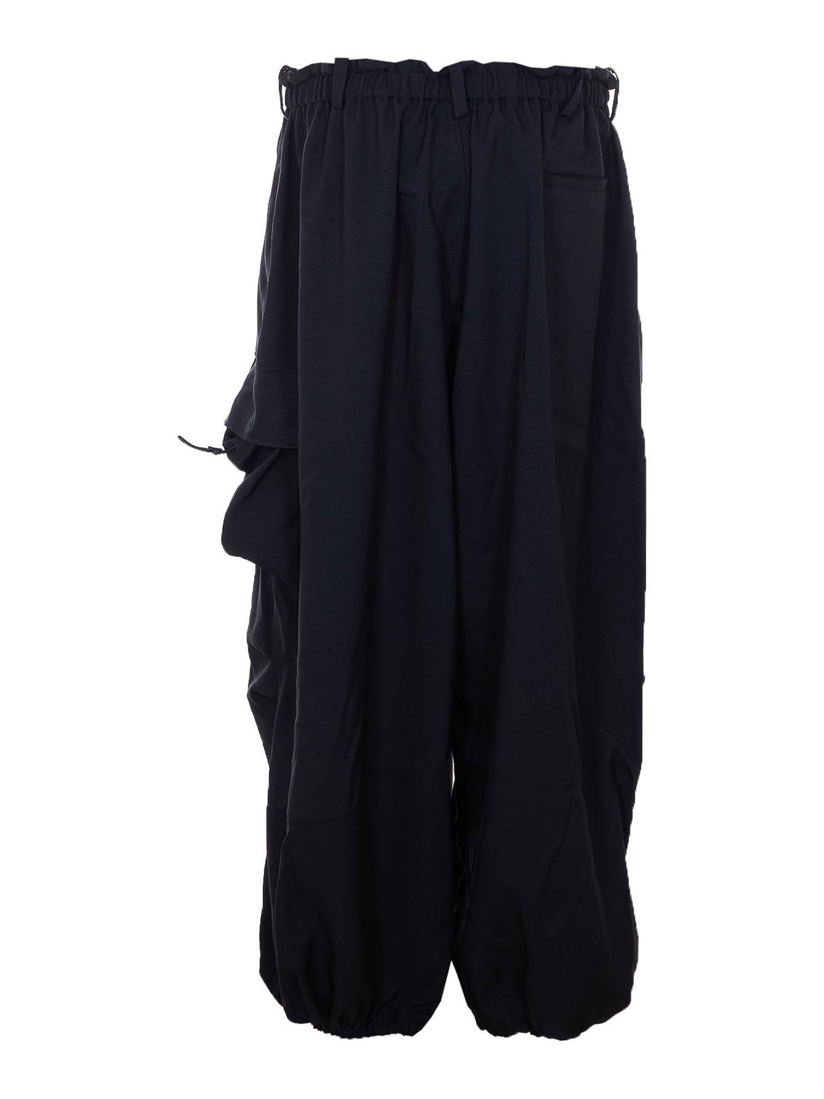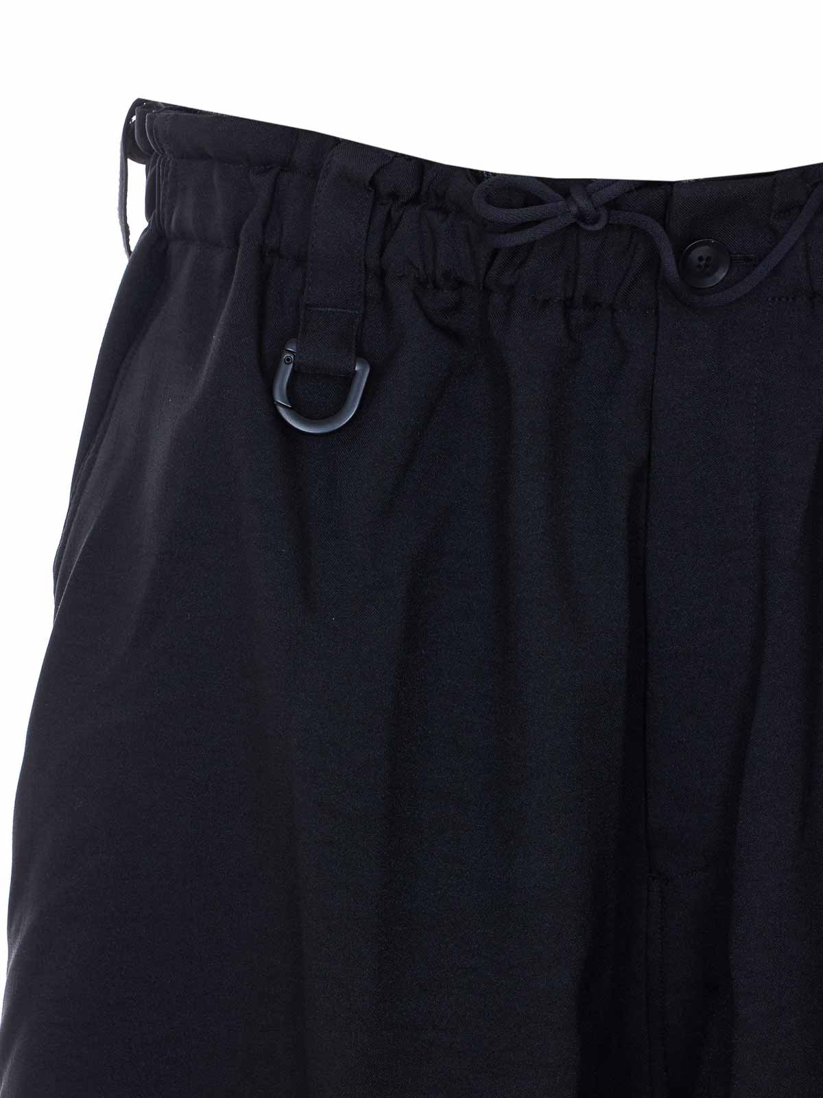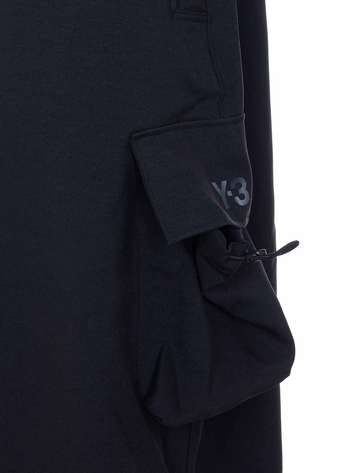 アディダス Y-3 ブラックカーゴトラックパンツ、ウエストにゴム入り、ファスナーとボタン留め、サイドポケット、ワイドレッグ、裾にカフス