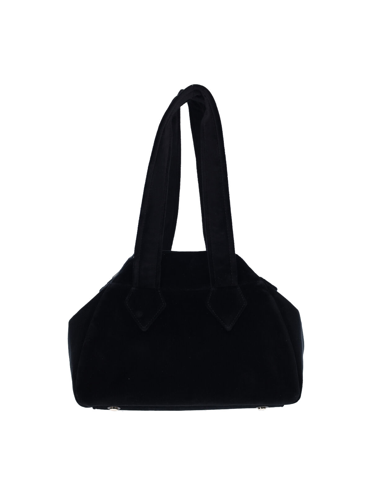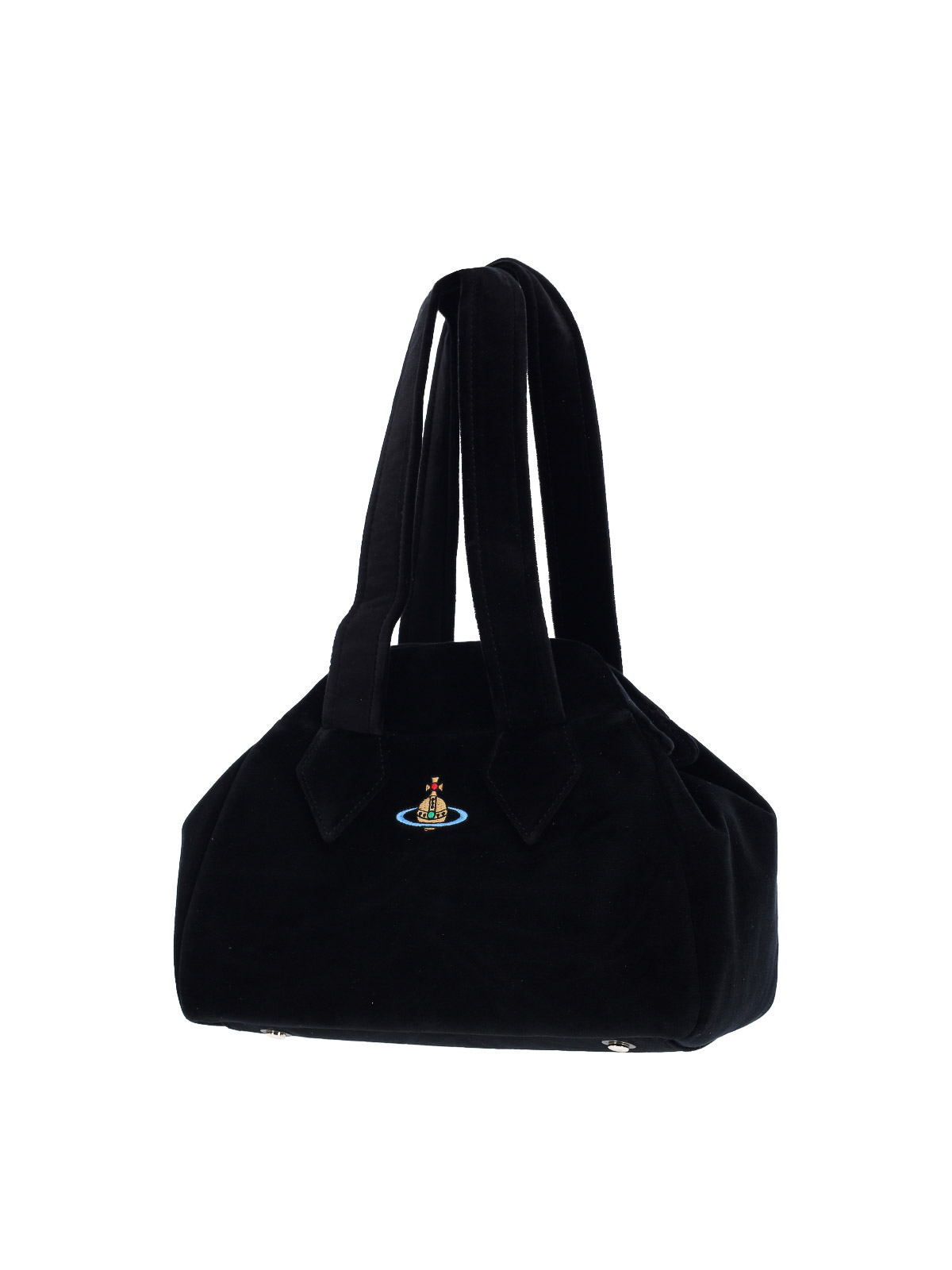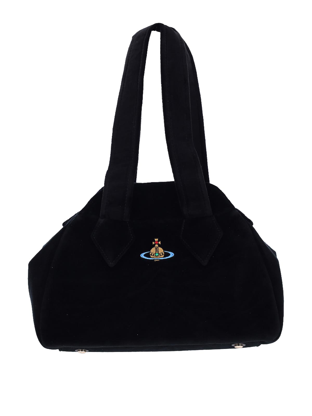 ブラックコットンのヴィヴィアン・ウエストウッド・ヤスミンミディアムハンドバッグ、トップハンドル2つ、ボタン留め、前面にマルチカラーのオーブのロゴ刺繍、内ポケット1つ、メインの内部コンパートメント1つ。