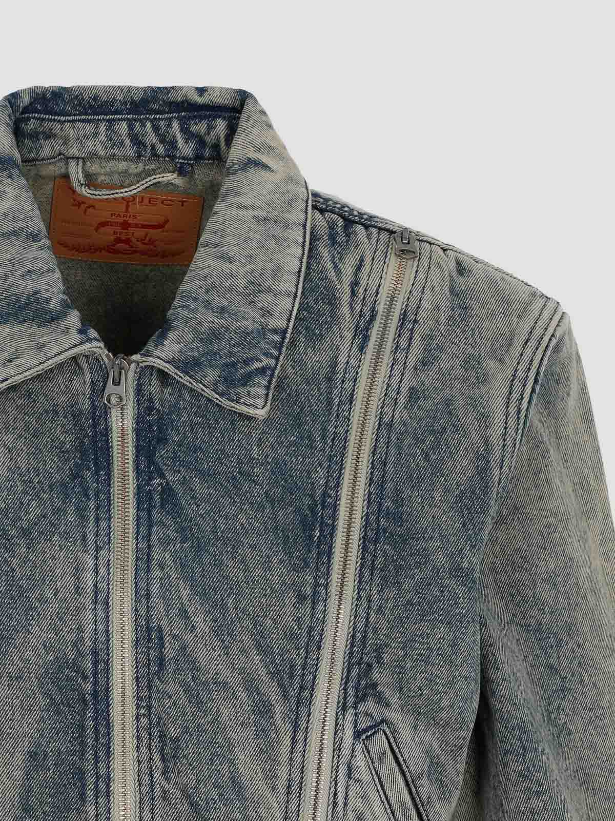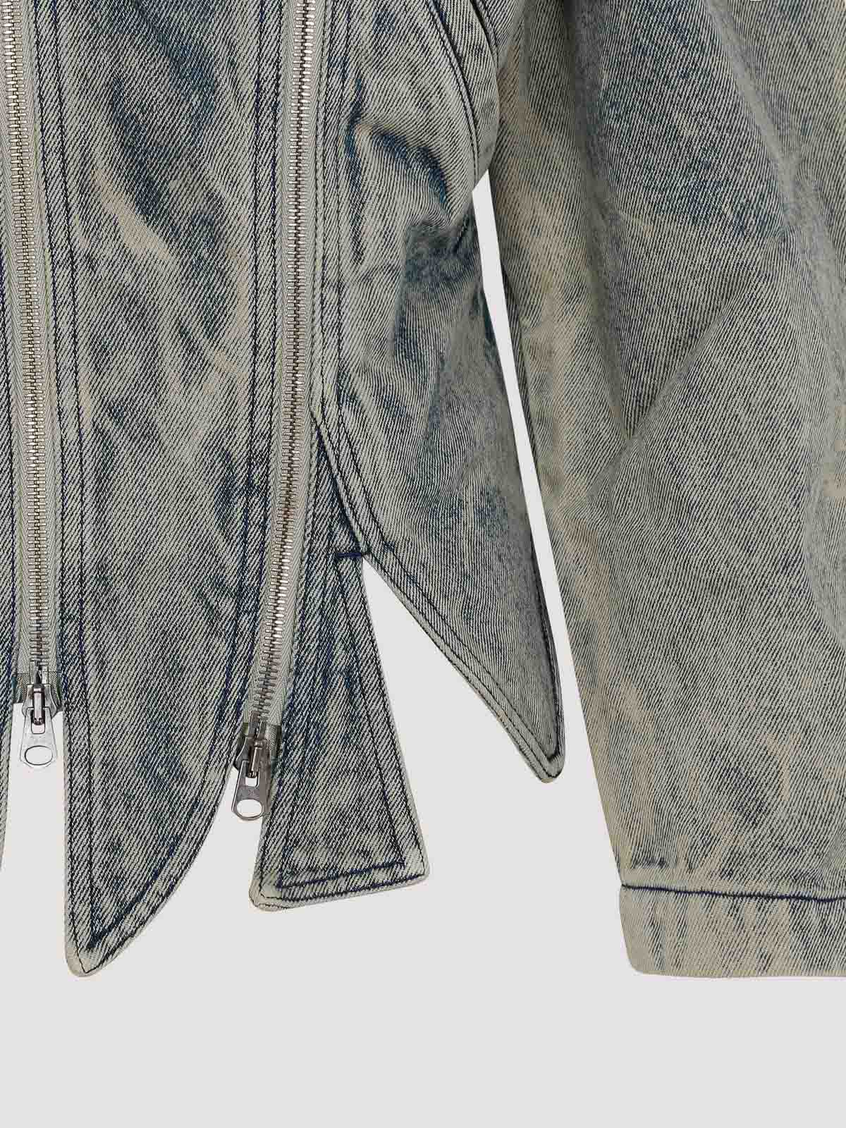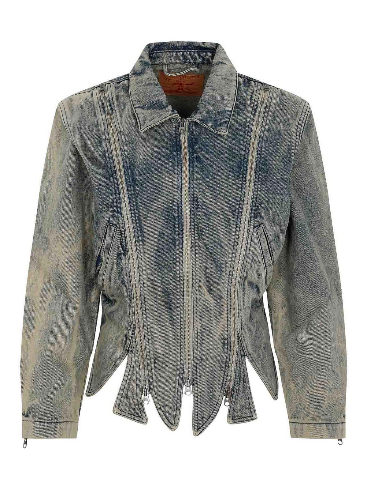 Y/Project ビンテージベージュチューダージップデニムジャケット。ピュアヴィンテージベージュコットンデニム製。ポインテッドカラー、ロングスリーブ、ジップカフス、フロントファスナー、フロントファスナー、フロントジッパー、フロントにさらに2つのジッパー、サイドウェルトポケット2つ、ルネサンス風のカットアウトフロントヘム、アシンメトリーヘム。