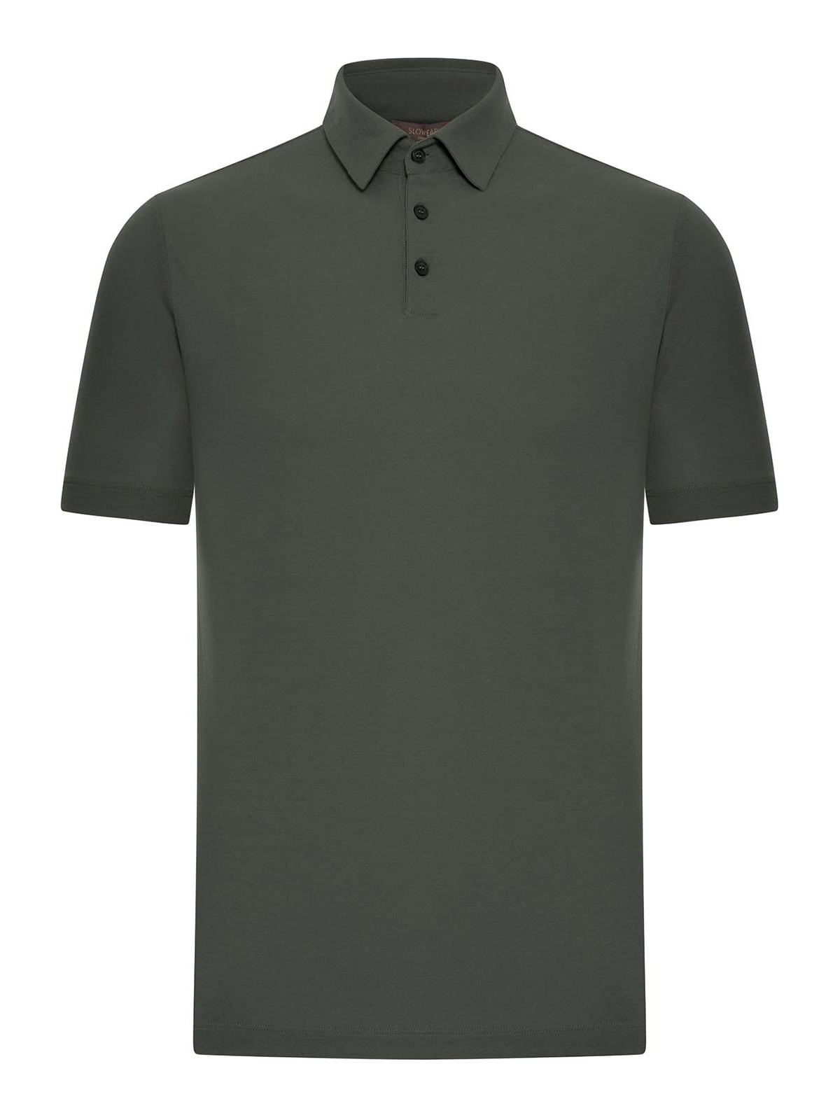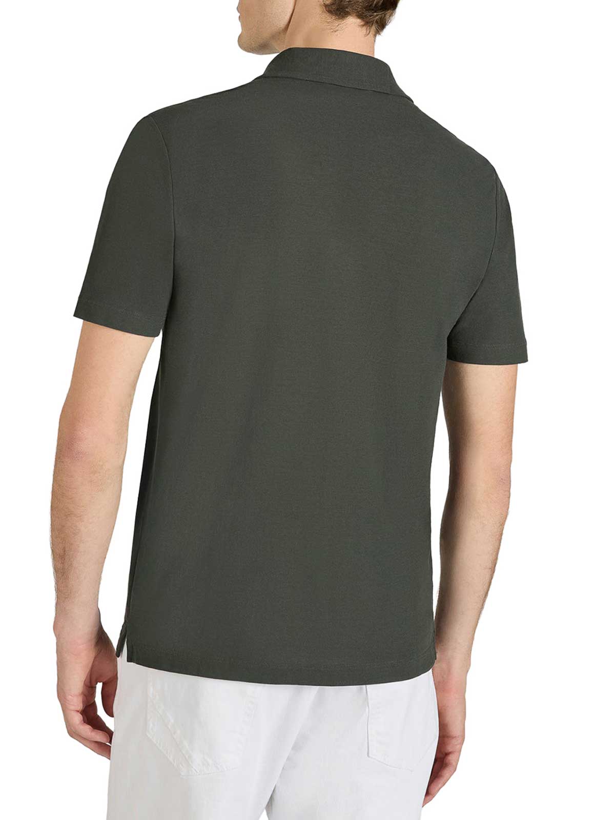 ポロカラー、3ボタンフロントクロージャー、ショートスリーブ、ストレートヘム、リブトリム、モデルの身長は1.85m、サイズ50のスリムフィット。丈夫で軽量で通気性のある構造のアイスコットン製で、体温調節機能に優れ、アイスコットン100%、色:グリーンザノーネ