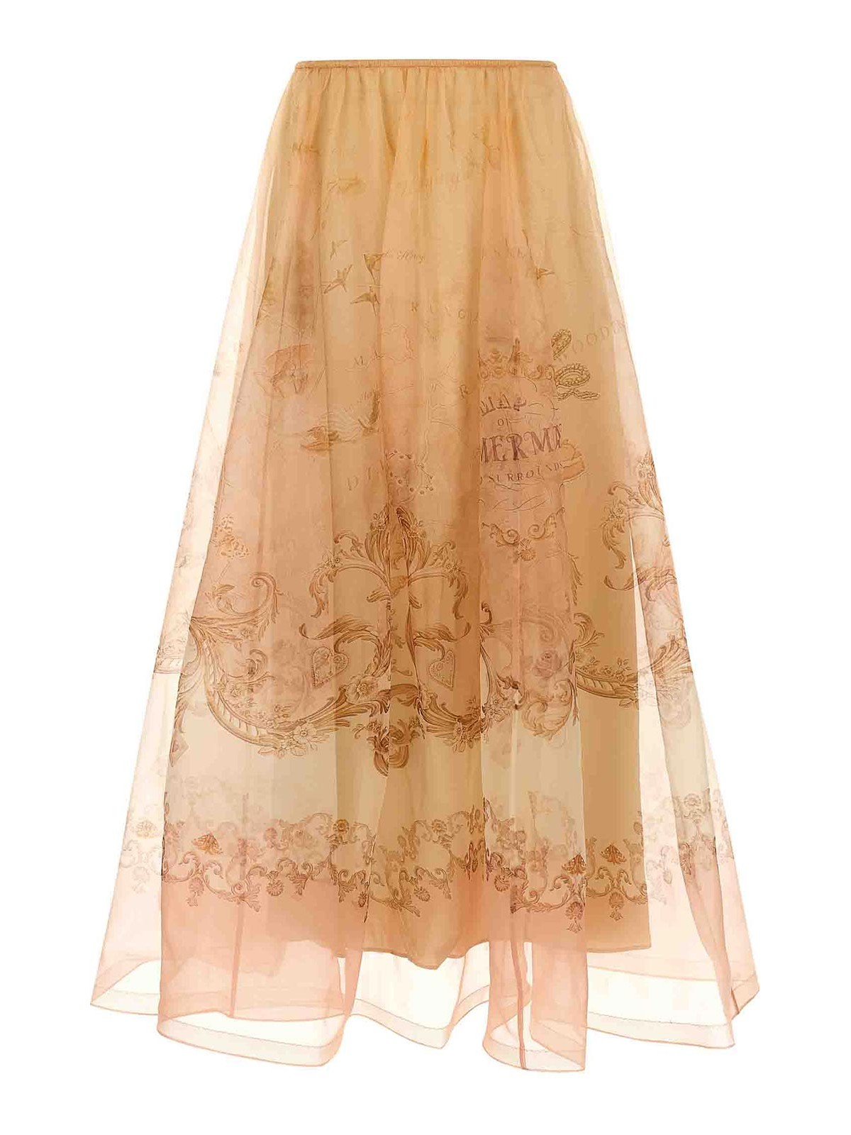 ヒプノティックオーガンザマキシオールオーバー柄シルクオーガンザスカート、しわのあるウエストバンド、フレアシルエット、ミッドウエスト、サイドジッパー、裏地。