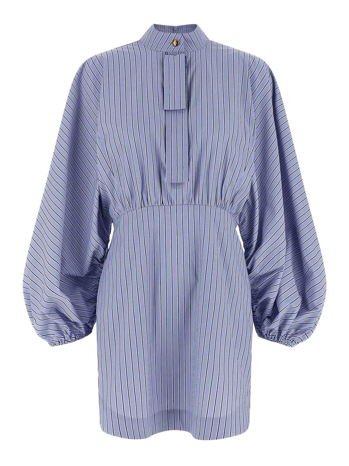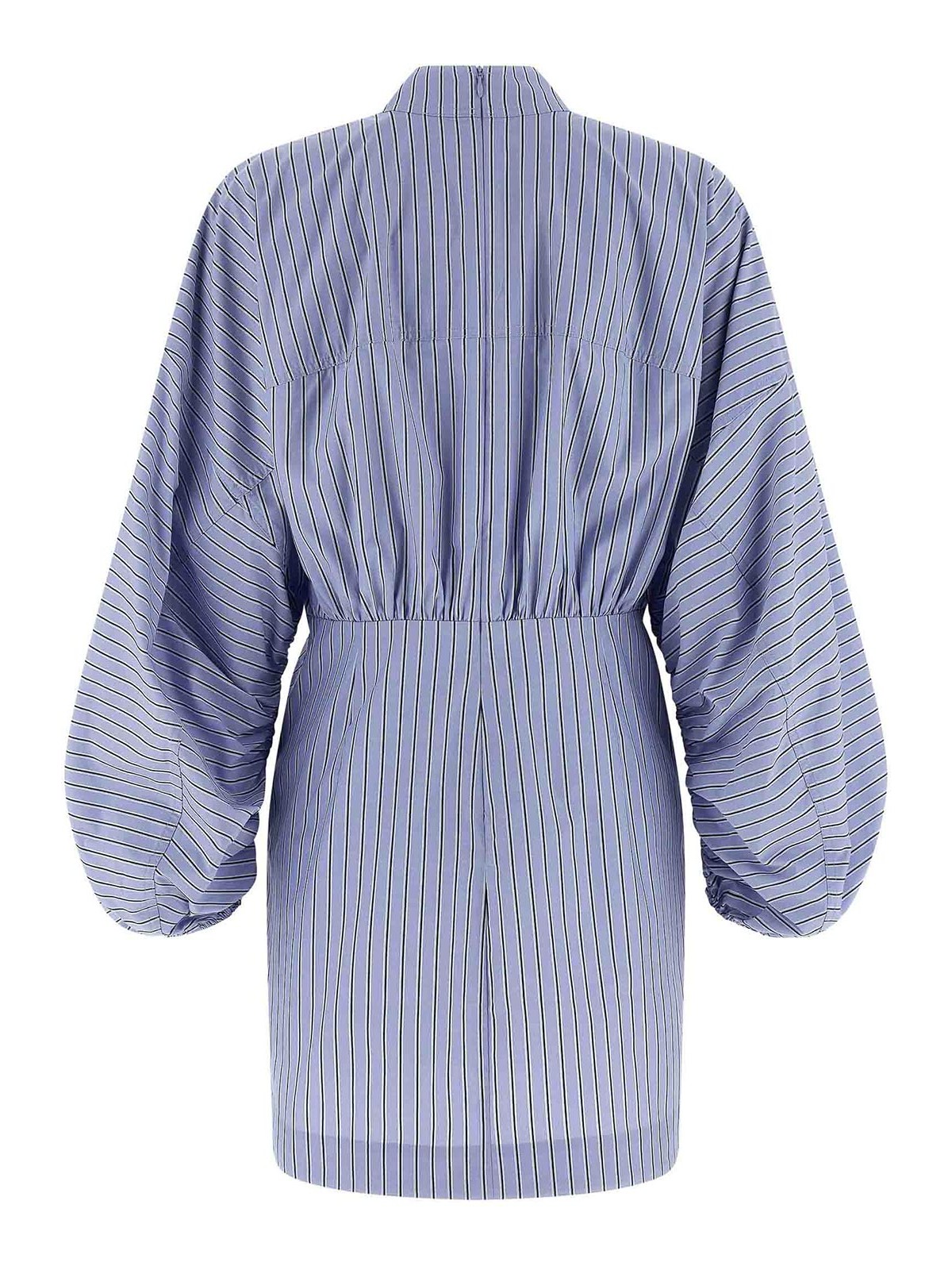 ドローストリングストライプのミニストライプコットンポプリンドレス、砂時計シルエットのシャツスタイル、インサート付きの韓国式襟、フロントボタン留め、袖口と伸縮性のある裏地付きのロングワイドバットスリーブ、ポケット。