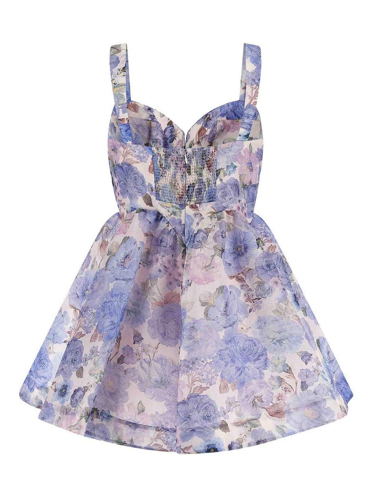 「スカイブルーム」柄のシルクオーガンザとリネンのリベリオンのミニドレス、フロントドレープとカップを仕切るV字型のアンダーワイヤーが付いたスイートハートネックライン、幅広のノースリーブショルダーストラップ、バックジッパー付きスモックステッチ、一体型チュール付きフレアフルスカート。ツイストロマンスコレクション。