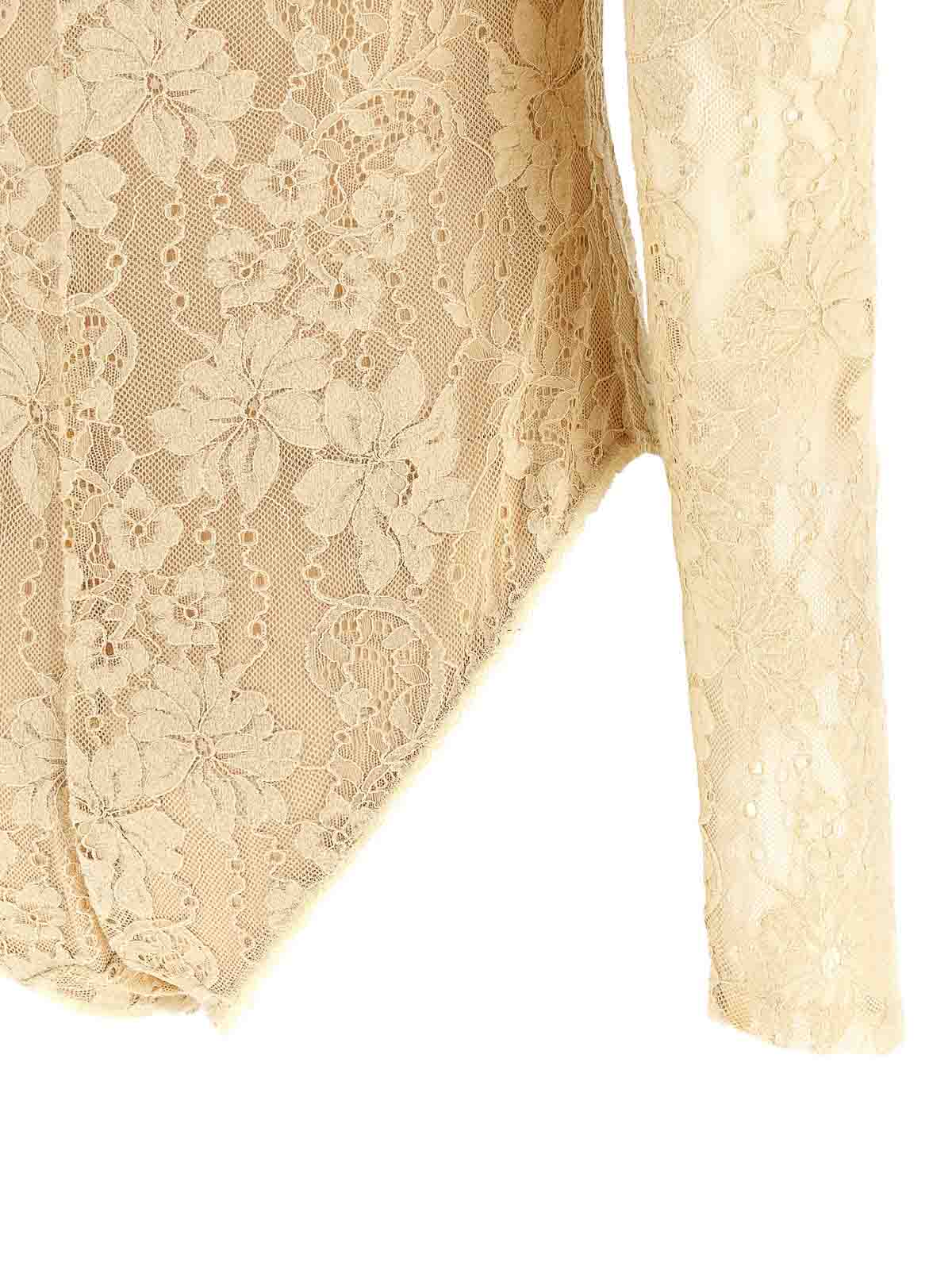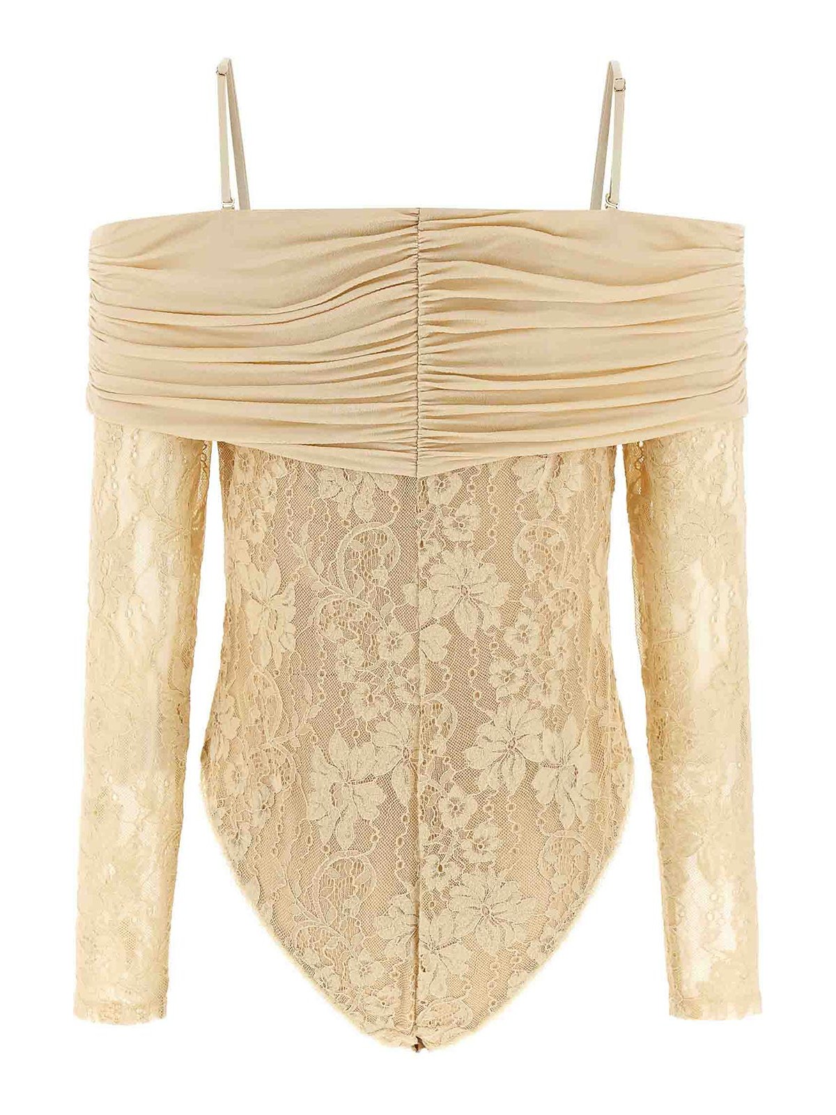 Rebellionのストレッチレースボディスーツ、メッシュの裏地付き、肩にカールインサートとドレープカバーが付いたオフショルダースタイル、調節可能で取り外し可能な細いストラップ、長袖、裾にスナップボタン留め。ツイストロマンスコレクション。
