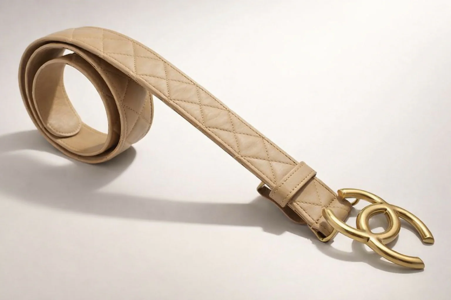 This beautiful every day belt is crafted of beige lambskin with signature diamond quilting. The belt adjusts with a gold CC buckle.