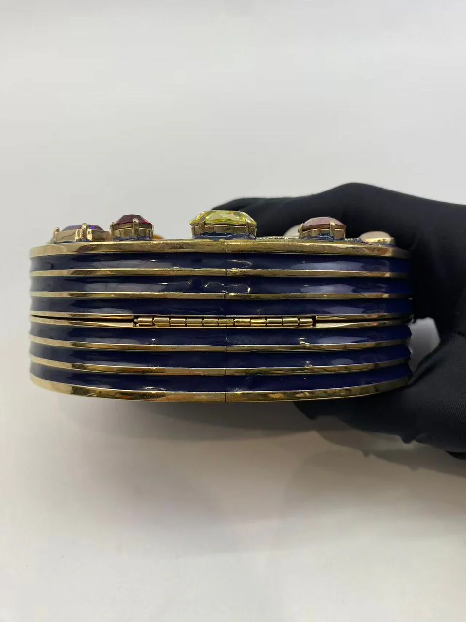 Suspended from a delicate gold chain strap, the bag can be worn elegantly on the shoulder or carried as a statement minaudière for evening occasions. Despite its jewel-like construction, the interior is thoughtfully designed to accommodate small essentials while maintaining its sculptural integrity.