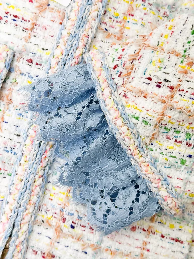 Iconic Chanel 2019 Beach Collection ensemble featuring a vibrant colorful check lace-trimmed jacket paired with a coordinating slip dress. The jacket showcases the house's signature tweed craftsmanship with playful seasonal detailing, while the slip dress offers elegant simplicity. Jacket sized 36, dress sized 34. A rare collector's piece from Chanel's coveted summer collection, perfect for those seeking authentic luxury with distinctive character and timeless appeal.