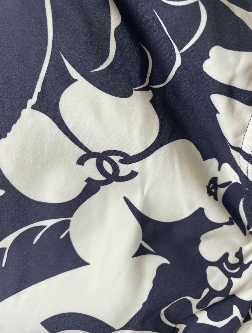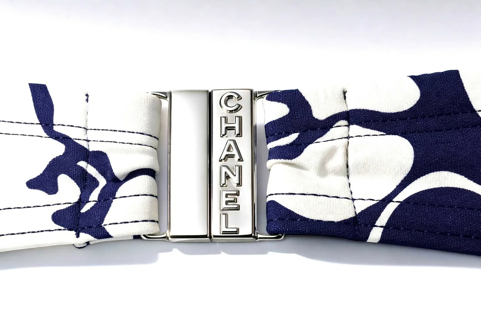 Features a Front Tie with 2 Sliding Crystal CC’s. Dark Navy, almost black and White Floral Print with CC logos. Back Metal Hook Clasp that spells CHANEL.