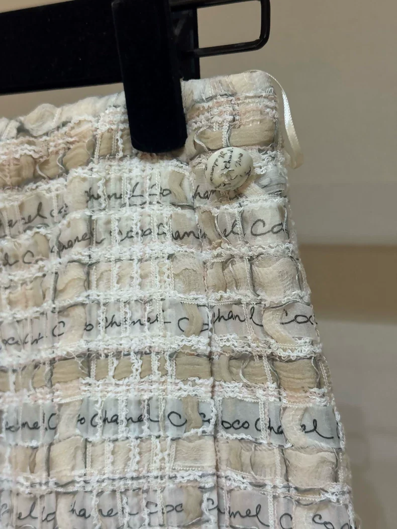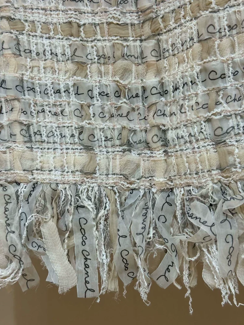 Chanel's 2022 Early Spring Collection skirt exemplifies the house's uncompromising approach to craftsmanship. Rendered in signature light pink Lesage tweed—a fabric reserved for Chanel's most coveted pieces—this skirt features the iconic interlocking CC logo and delicate tassel detailing that define the collection's refined aesthetic. Cut in size 36, the skirt showcases the precise tailoring and luxurious hand-feel characteristic of Chanel's atelier work. The Lesage tweed, woven with meticulous attention to texture and color, creates a sophisticated drape that transitions seamlessly from day to evening wear. Offered in new condition, this piece represents an exceptional acquisition for collectors of contemporary Chanel haute couture.