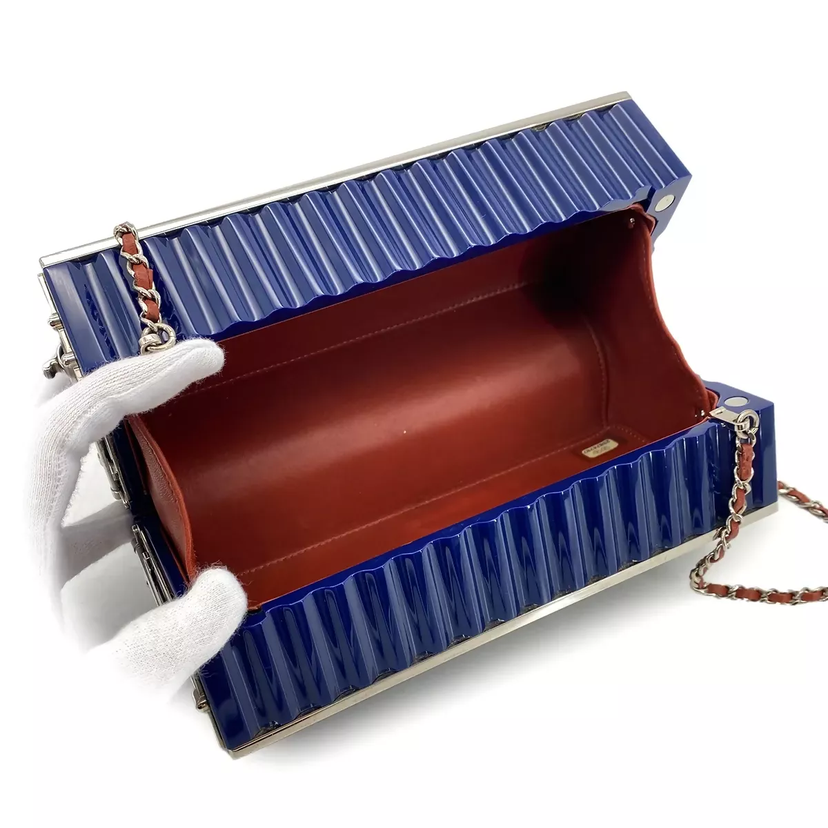 From Karl Lagerfeld’s 2017/18 Métiers d’Art “Paris–Hamburg” collection, this rare minaudière reimagines the utilitarian shipping container as a piece of high luxury. Crafted from multicolor high-gloss plexiglass in deep navy with corrugated detailing, it features bold green CHANEL lettering on the front, an oversized red CC logo on the back, and a silver-tone frame construction. A burgundy leather-lined interior adds a touch of refinement, while the signature chain strap interwoven with red leather allows it to be carried on the shoulder or crossbody.