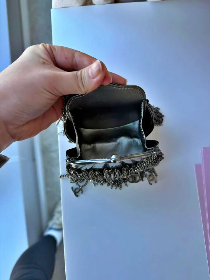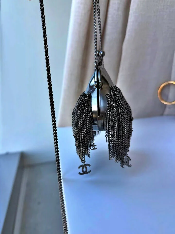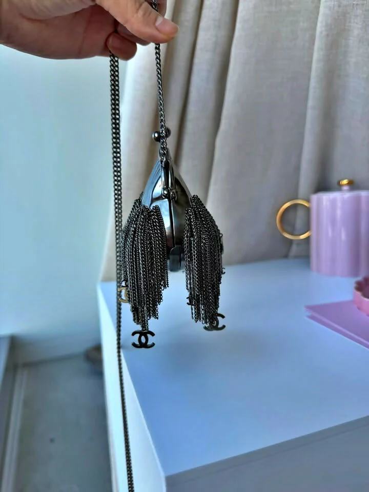Suspended from a delicate chain shoulder strap, the bag combines jewelry-like craftsmanship with couture sensibility. The iconic CC emblem subtly appears within the fringe, a discreet yet unmistakable signature of the house.