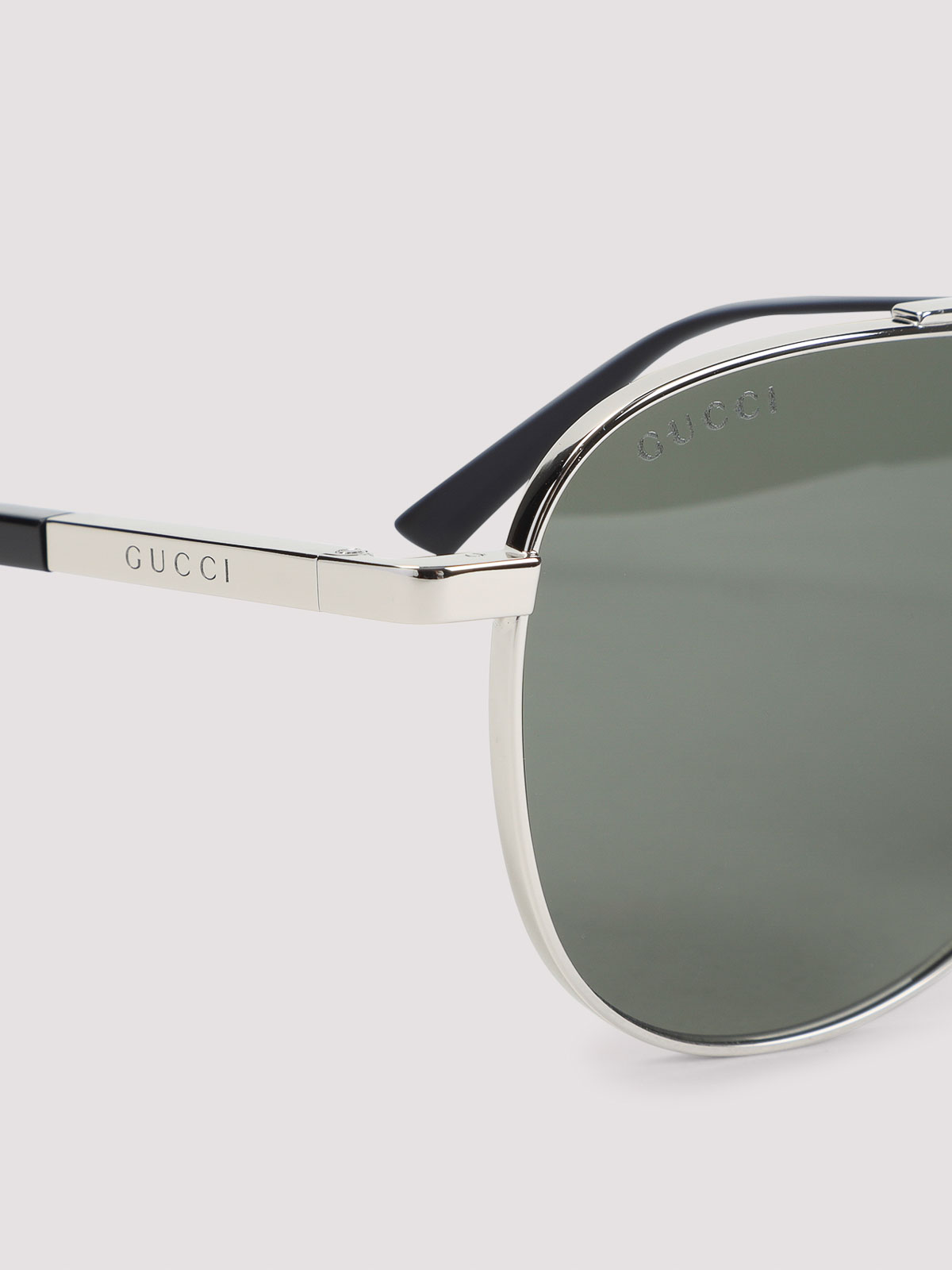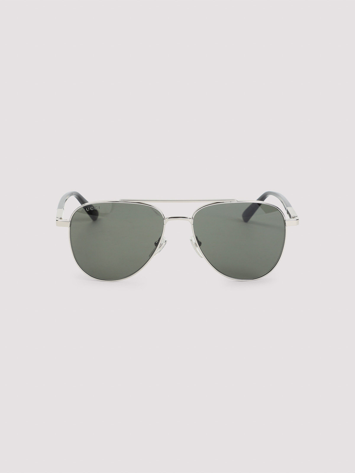 Gucci silver acetate sunglasses. aviator sunglasses crafted from silver-toned metal, featuring black acetate lenses, a double bridge, adjustable nose pads, and black temples with logo and web detail.