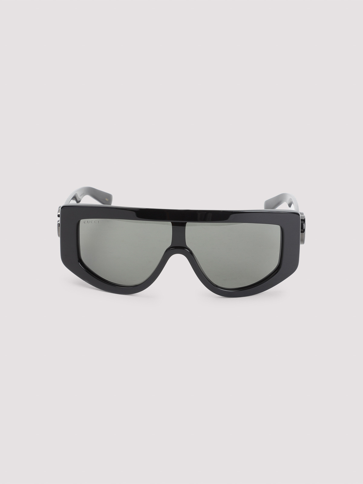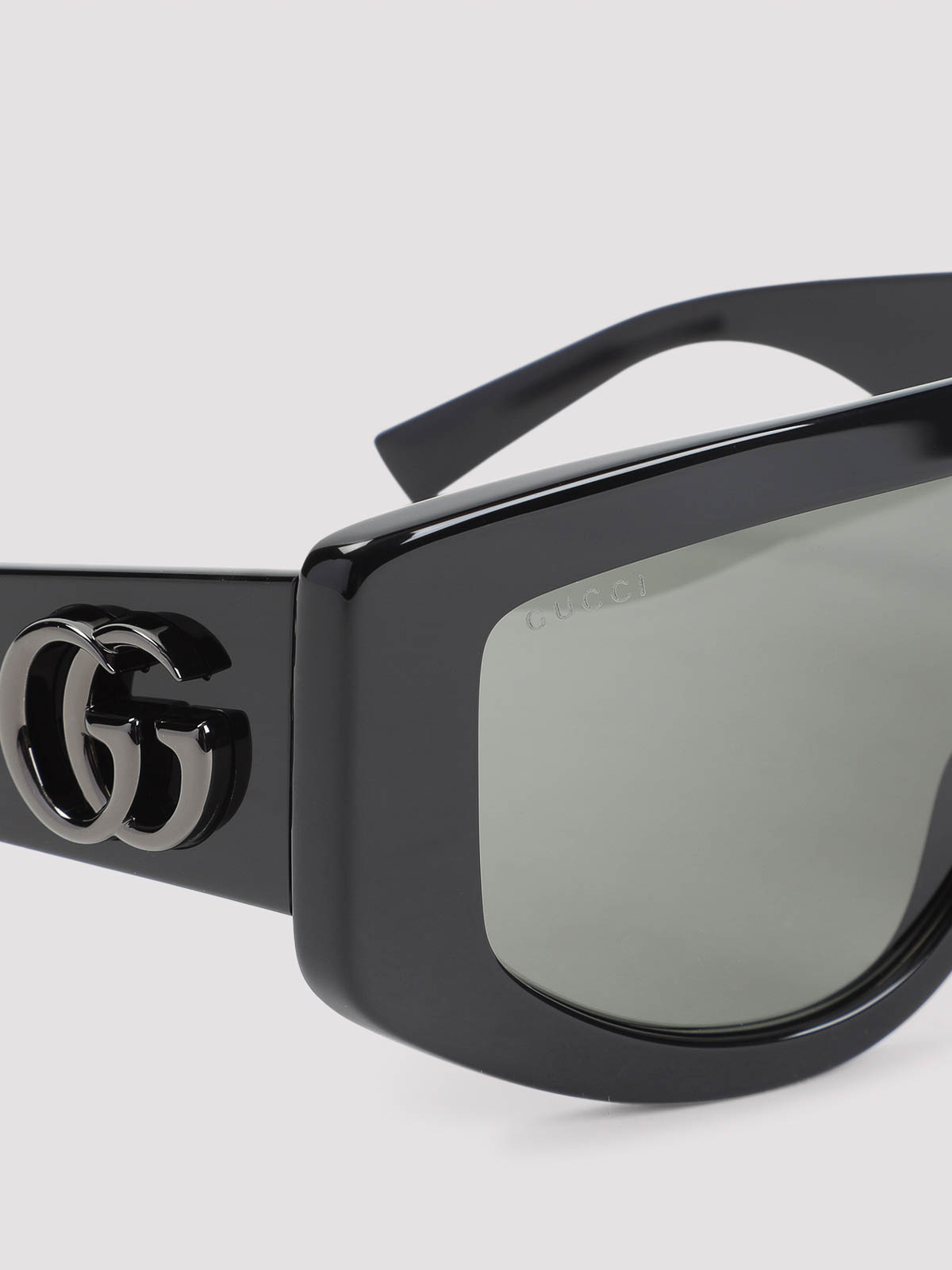 Gucci black acetate sunglasses. oversized rectangular sunglasses crafted from black acetate, featuring grey lenses and bold tonal temples with a silver-toned gg logo detail.