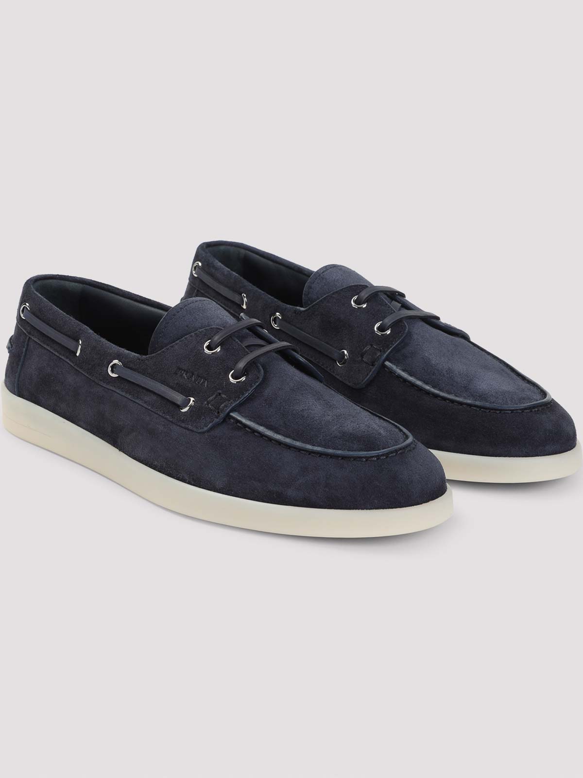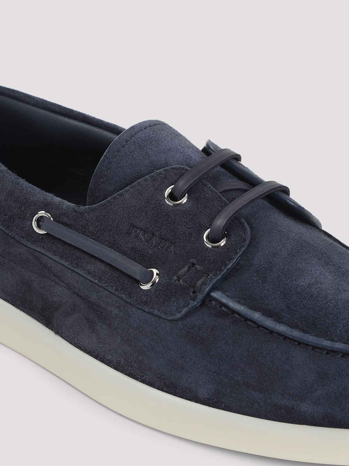 Prada blue suede calf leather allacciate lace-up shoes. pure blue suede calf leather shoes, round toe, top lace-up fastening, side tonal straps, slip-on style, flat design, white rubber sole.