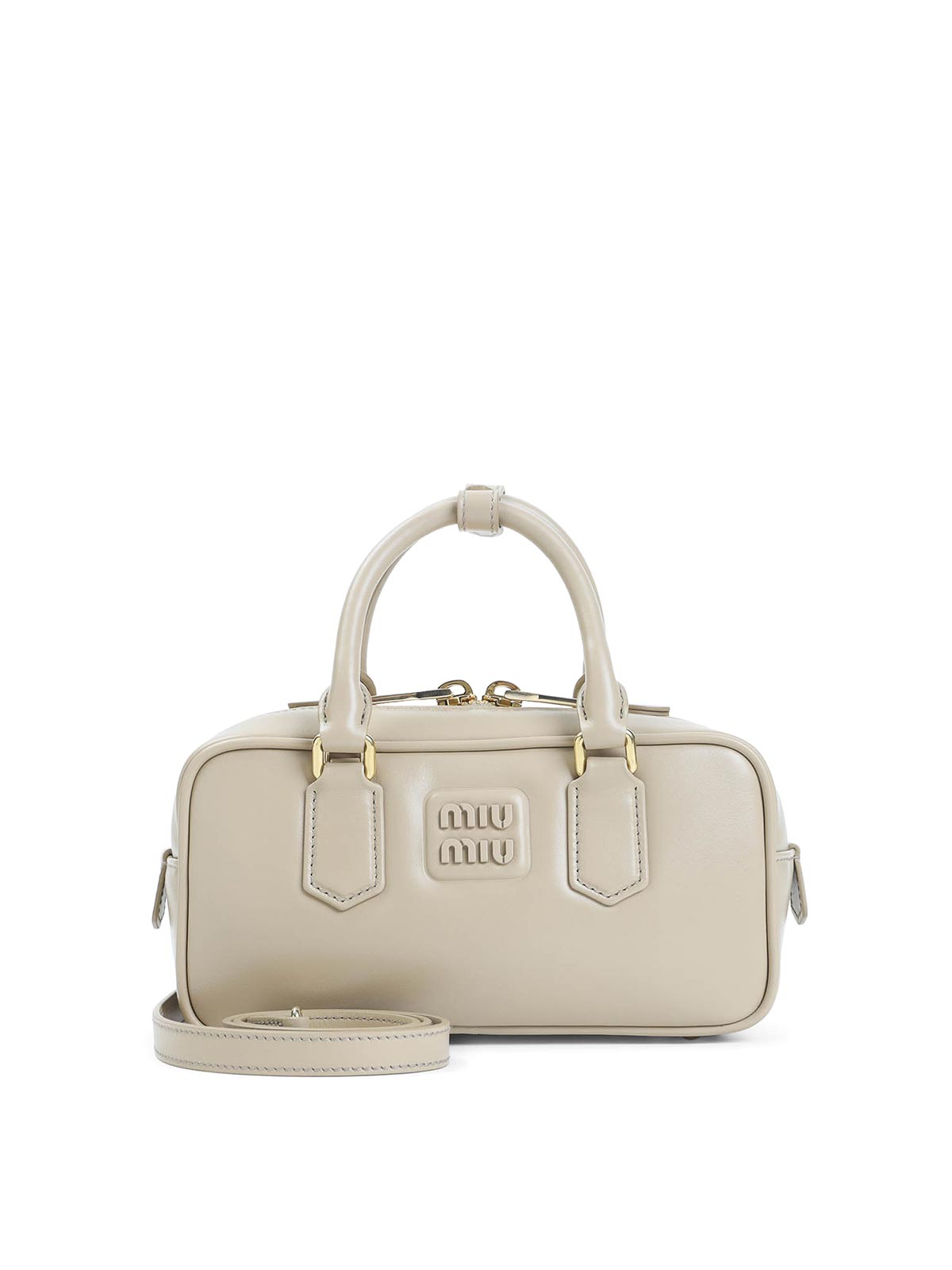 Miu miu arcadie sabbia calf leather handbag. crafted from sabbia calf leather, golden-toned hardware. two handles, two-way zip fastening on the top, front embossed logo. attachable and adjustable shoulder strap. inner pocket, satin lining.