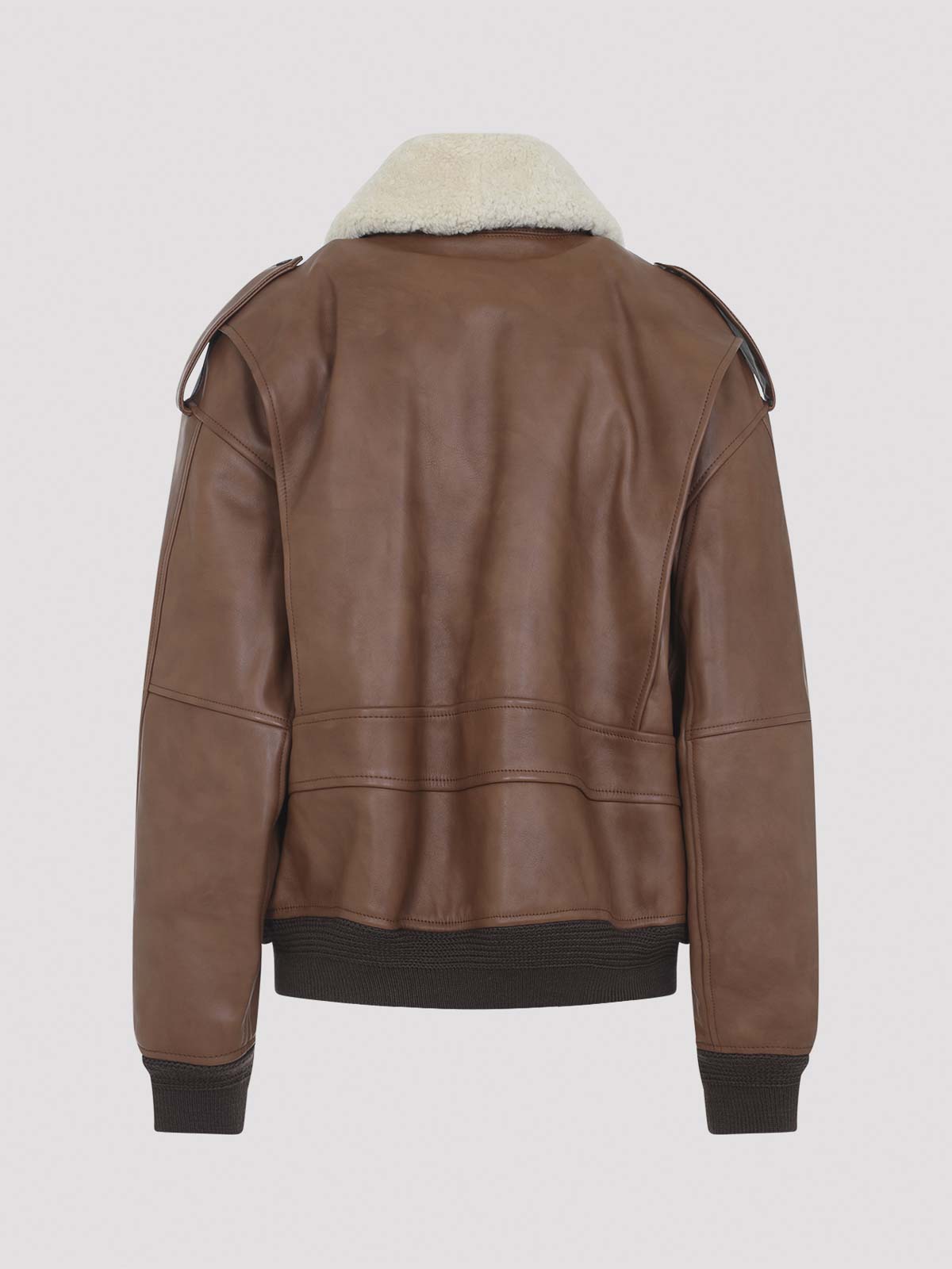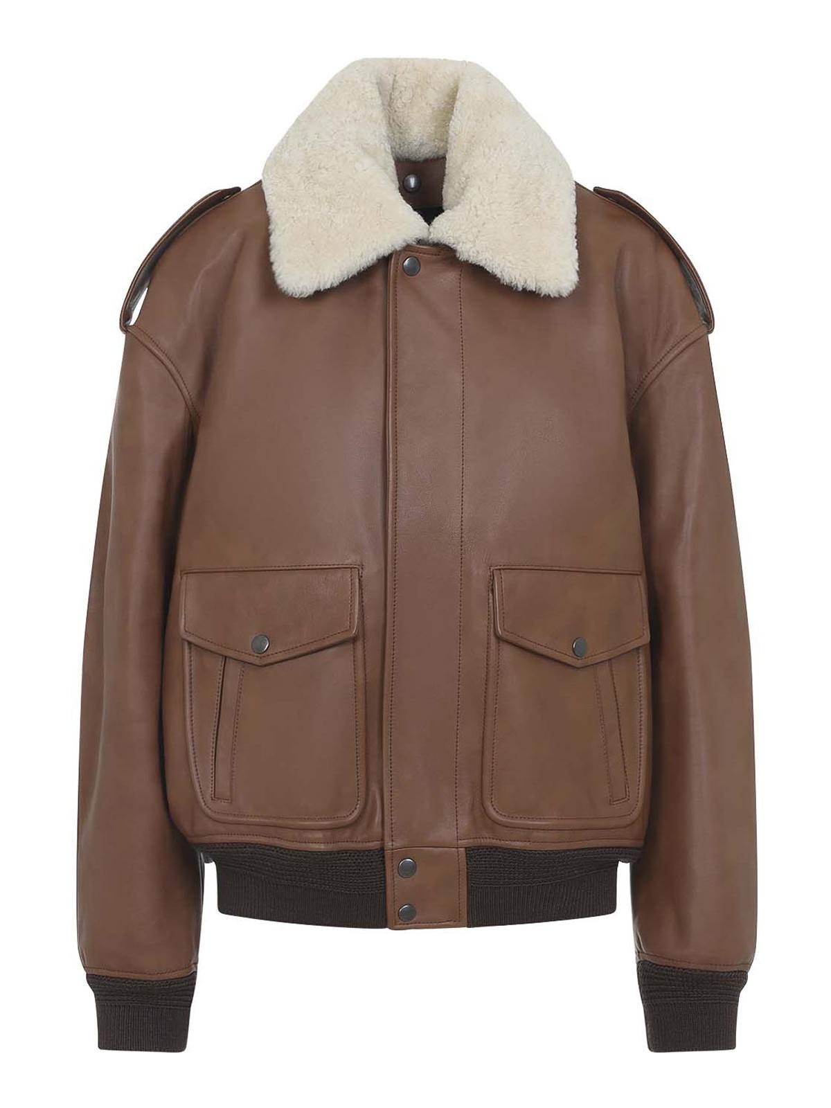 Saint laurent aviator brown calf leather jacket. crafted from brown grained calf leather, featuring a shearling collar, concealed zip and snap button fastening, two front flap pockets, dropped shoulders with epaulets, long sleeves, ribbed hems, and a quilted cupro and cotton lining.
