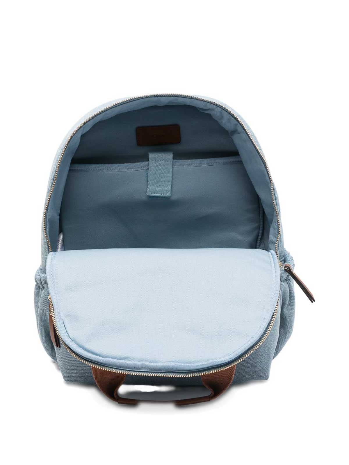 Features light blue handles adjustable shoulder straps front pocket with zip embroidered details elasticated side pockets external composition: 100% cotton c20867