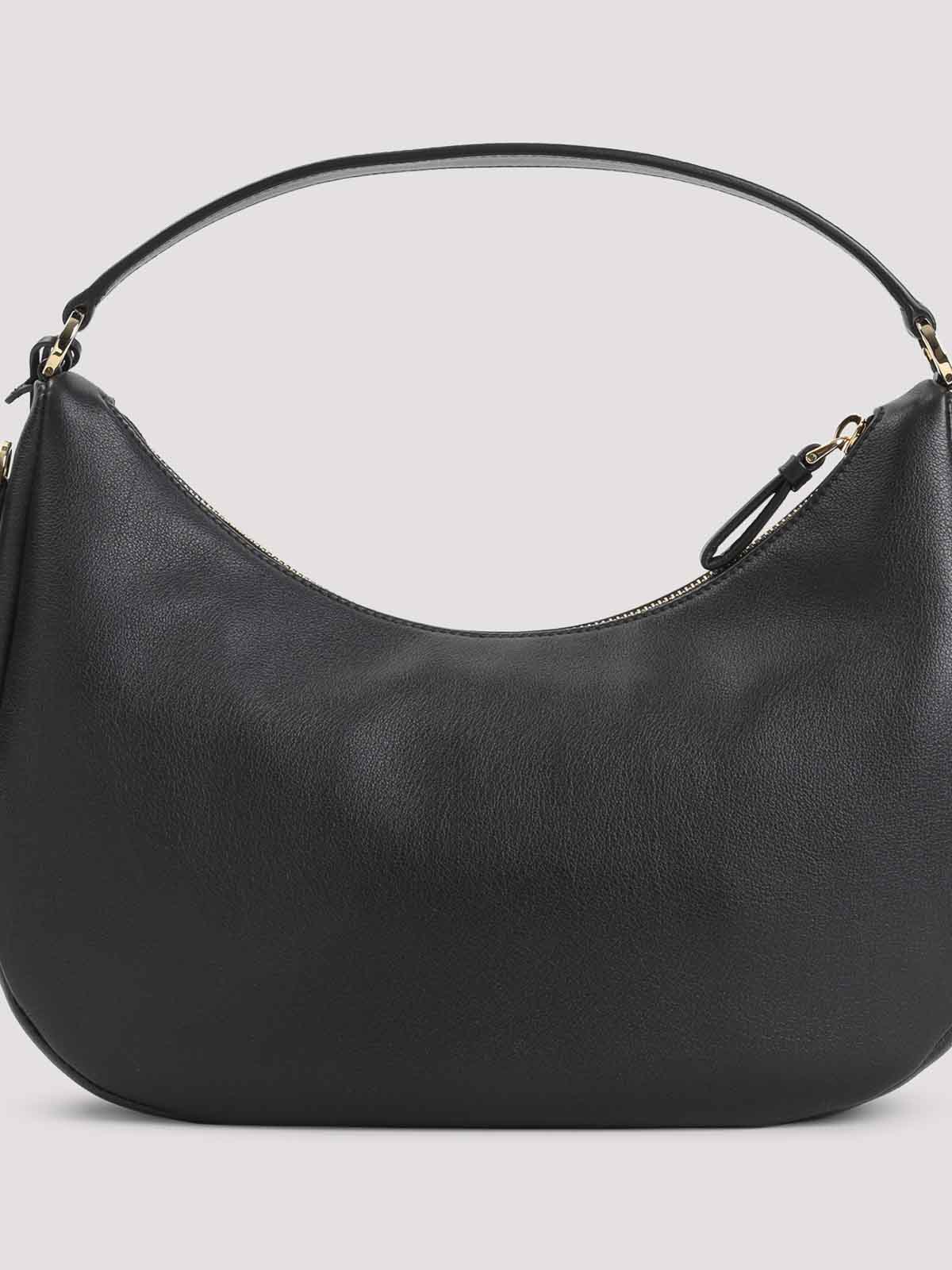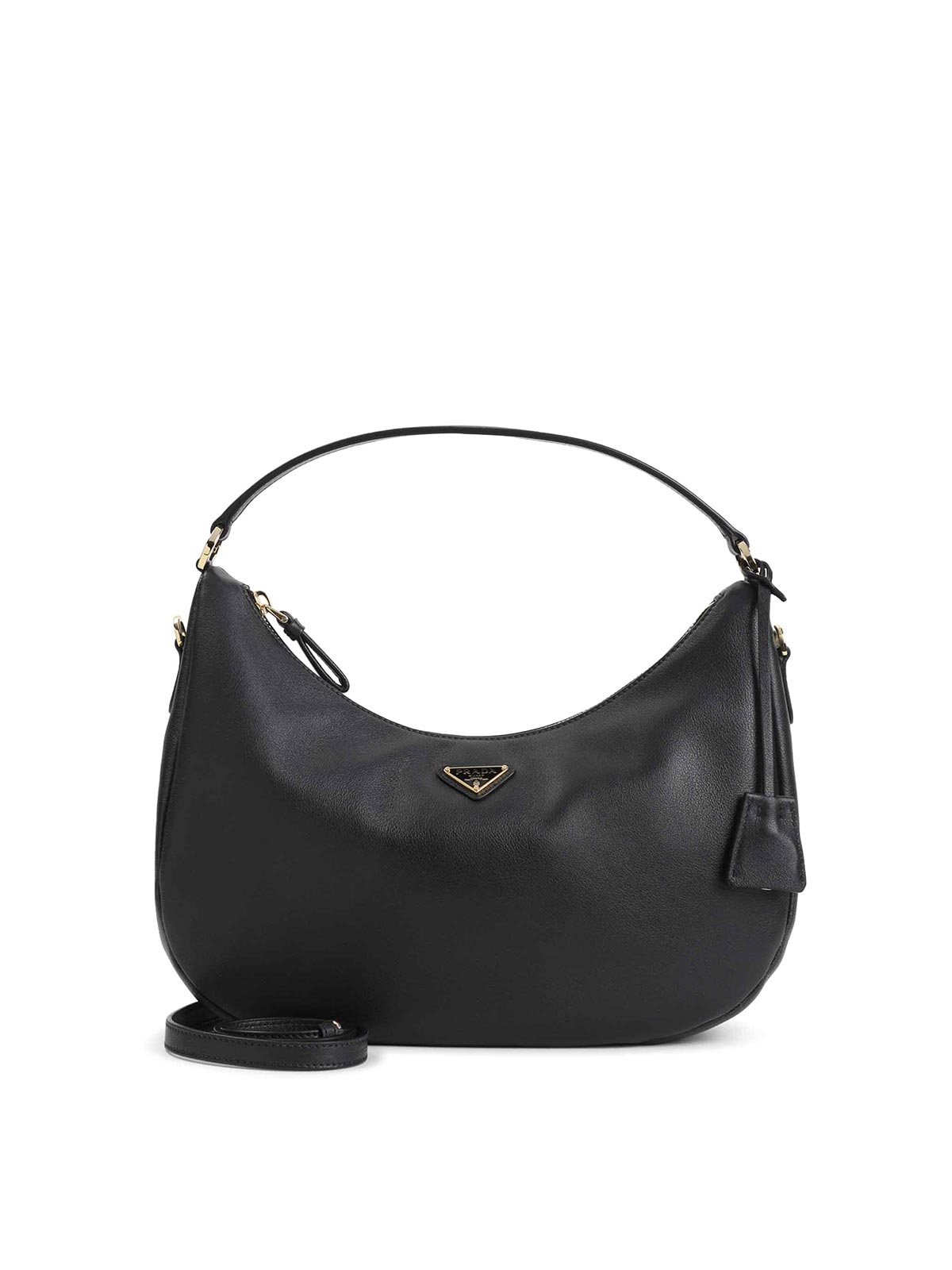 Prada black calf leather bag. pure black calf leather bag, top tonal handle, top zipped fastening, side tonal leather tag, front metallic triangle logo, adjustable and detachable shoulder strap, one main compartment.