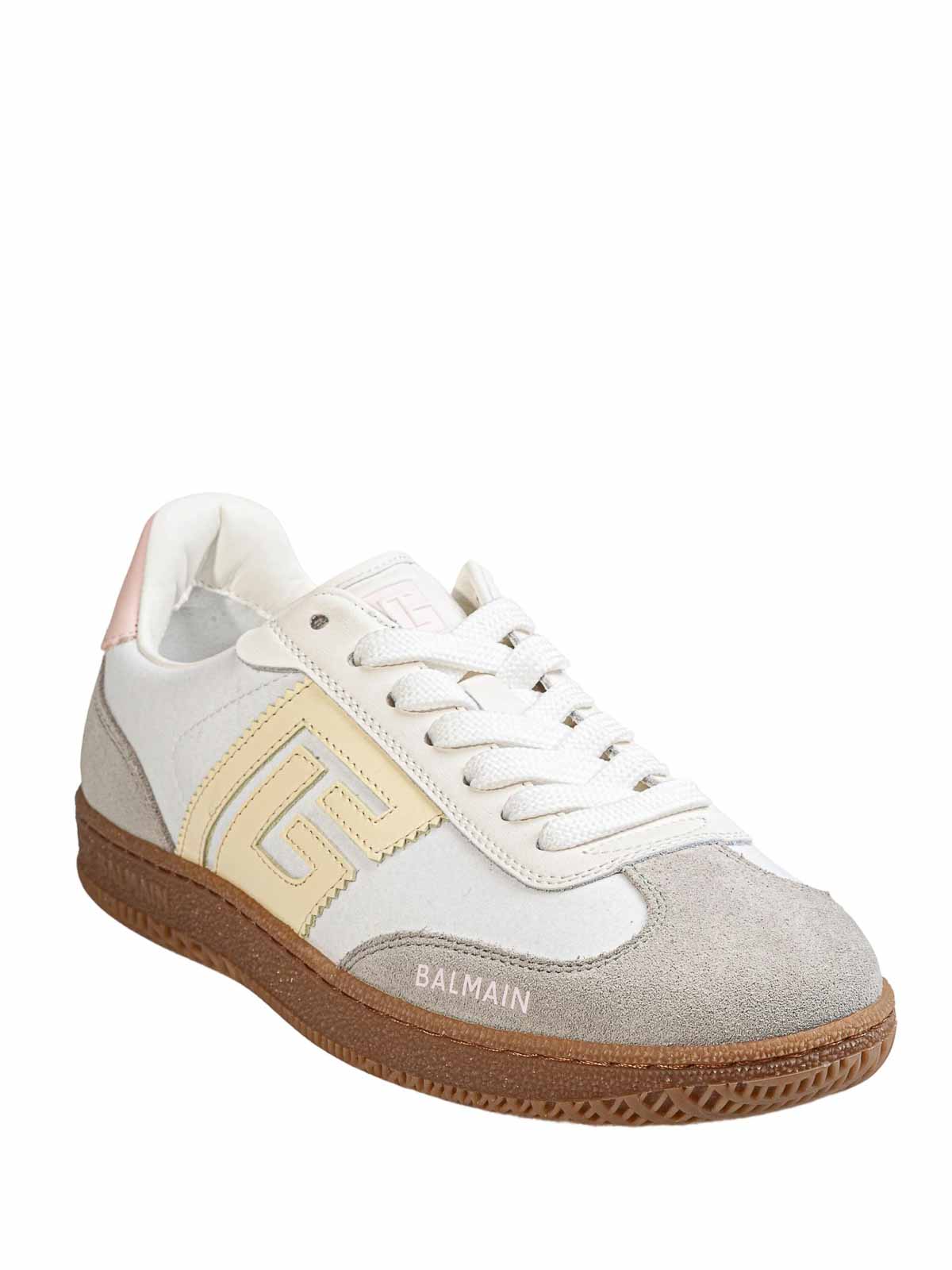 Swan sneakers in smooth canvas and ivory colored suede leather in laced tongue with embossed diamond pattern and logo with logos on the sides embossing of silver Balmain logos on and on the back thick rubber exterior embossed Balmain logo and ta main material