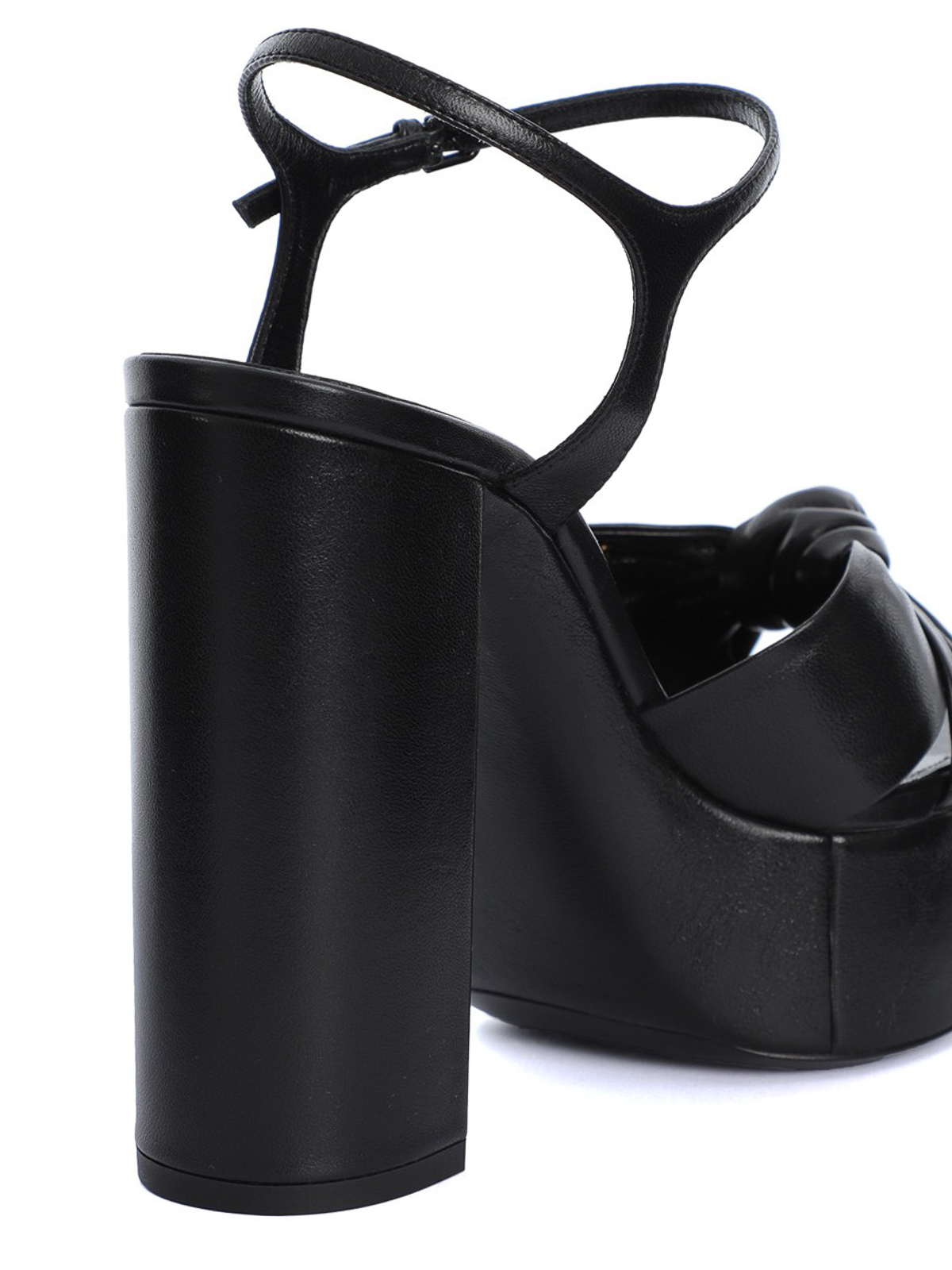 Nappa platform sandals featuring knotted band, adjustable ankle strap and wrapped block heel.