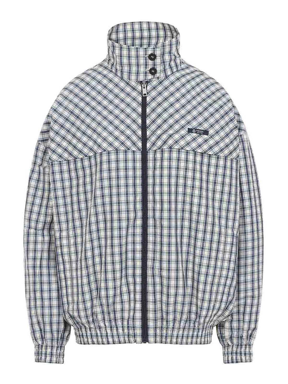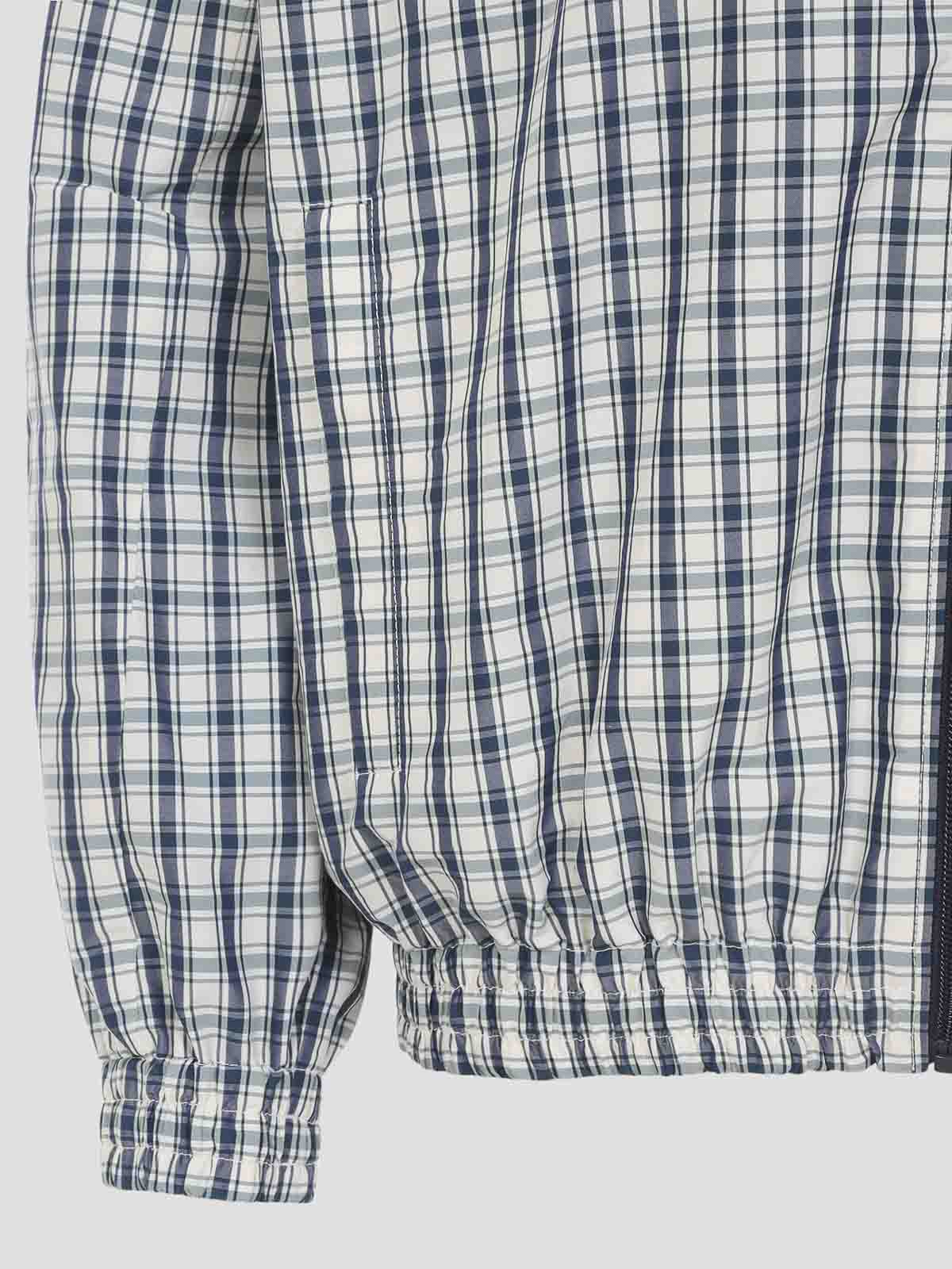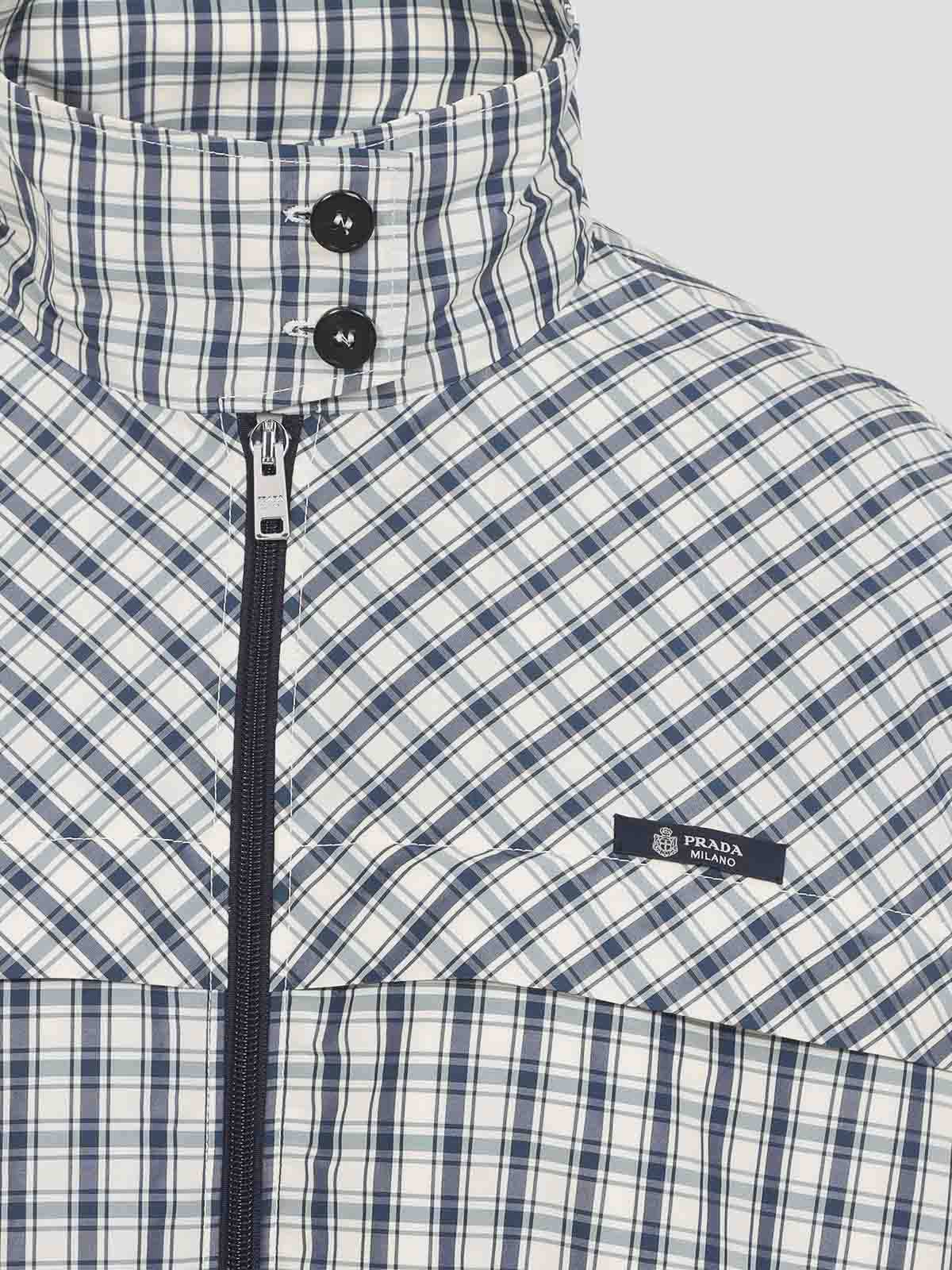 Prada ivory white cotton blouson jacket. crafted in cotton and polyamide blend. stand-up collar with buttoned fastening, front zipped fastening, chest patch logo, side pockets, dropped shoulders, long sleeves, elastic cuffs and hem, straight hem. ivory white and blue checked pattern all-over.