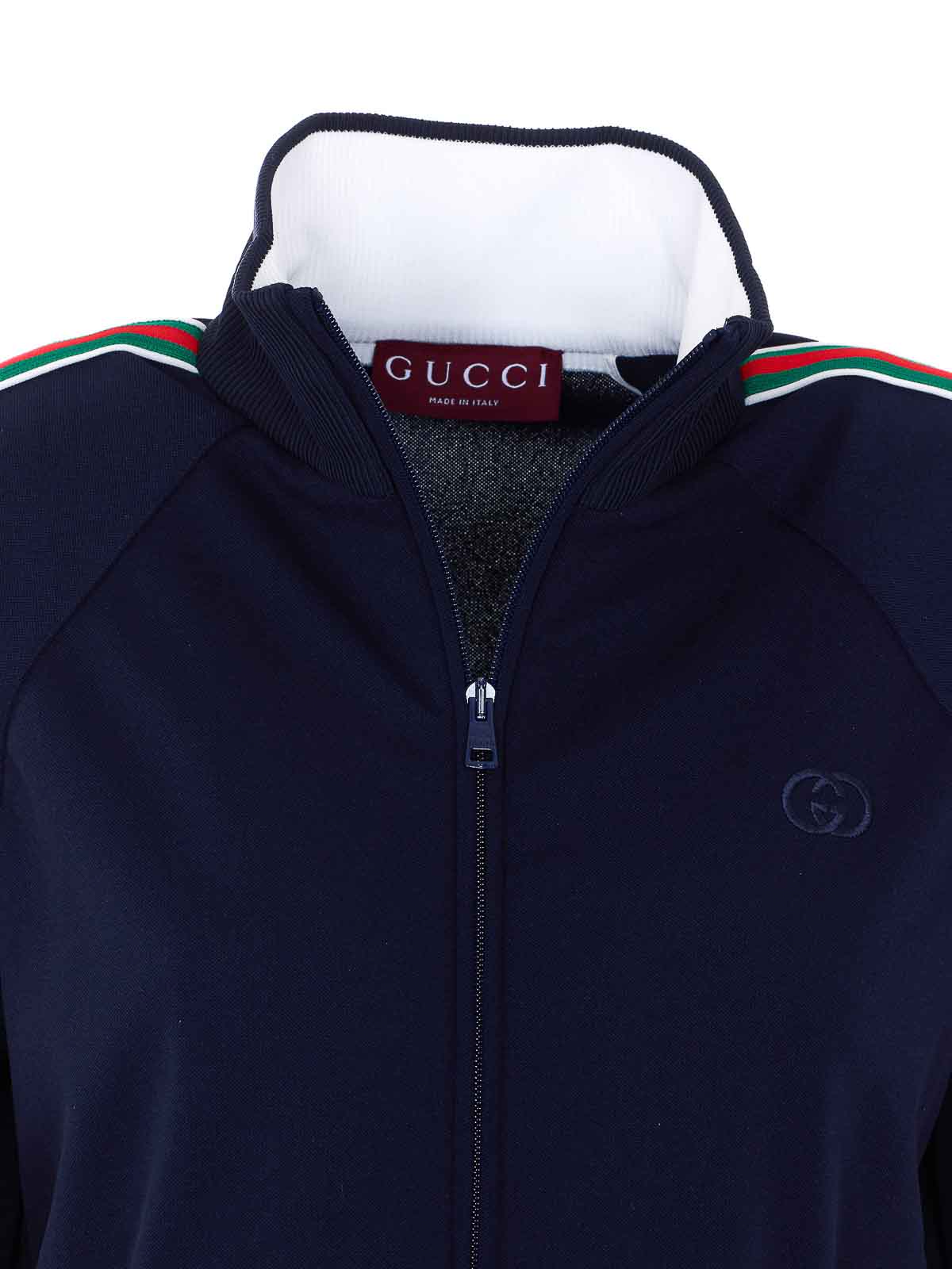 Gucci blue hoodie with zip closure, high neck, long sleeves, embrodiered on the front, pockets