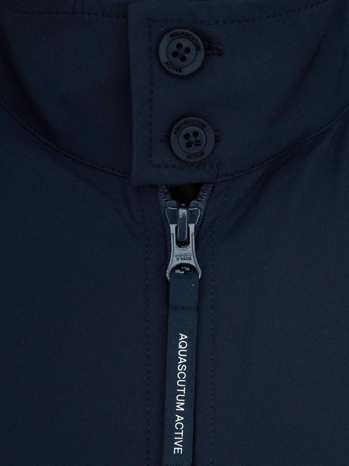 Aquascutum active, shell sp harrington, 4-way stretch technical jacket, navy, contemporary reinterpretation of an icon of British outerwear, the shell sp harrington expresses the aquascutum active approach to functional heritage in a modern and performance-driven key. designed for a dynamic urban lifestyle, it combines classic harrington silhouette and advanced technical contents. made of shell sp technical fabric, a nylon and elastane shell with 4-way elasticity (horizontal and vertical), guarantees maximum freedom of movement. the multilayer construction integrates windproof and breathable membrane with water-repellent treatment, ensuring protection and comfort in variable weather conditions. the design maintains a clean and balanced profile, with a full double-slider YKK zip closure, elastic knit hem and cuffs and two functional front pockets. inside, discreet aquascutum active club check details recall the brand's heritage, while the identification label of the shell sp fabric underlines the technical identity of the garment. the aquascutum active silicone badge with micro-injection customisation, applied on the left sleeve, signs the model with a distinctive character., shell sp technical fabric, 4-way stretch shell, multilayer construction, fabric weight: 140 gsm, water-repellent treatment, windproof and breathable membrane, two-way ykk full zip closure, elastic knitted bottom and cuffs, two front pockets, internal aquascutum active club check detail, internal fabric identification label, silicone badge on the left sleeve, regular fit, ideal for transitional seasons and urban use.