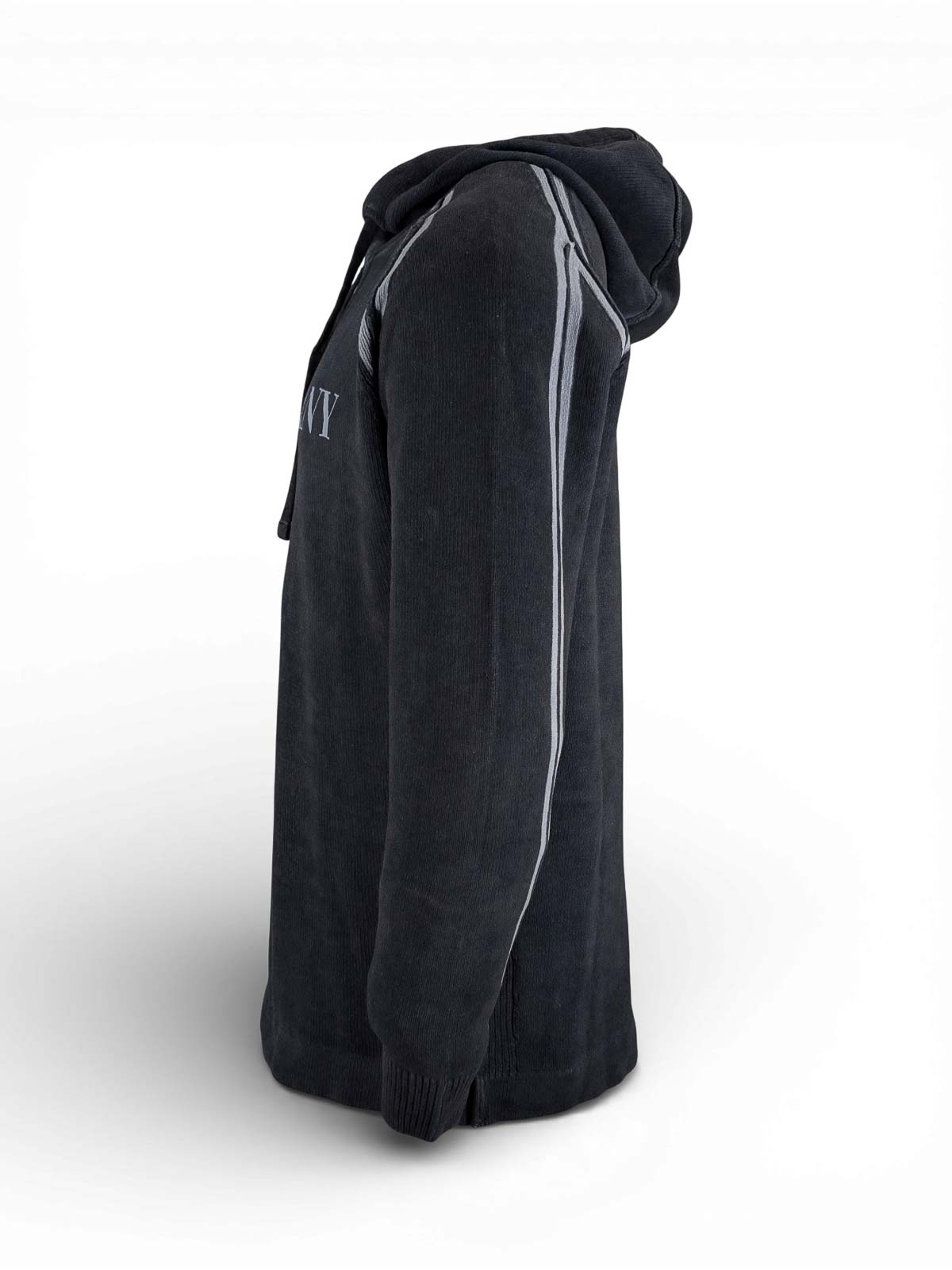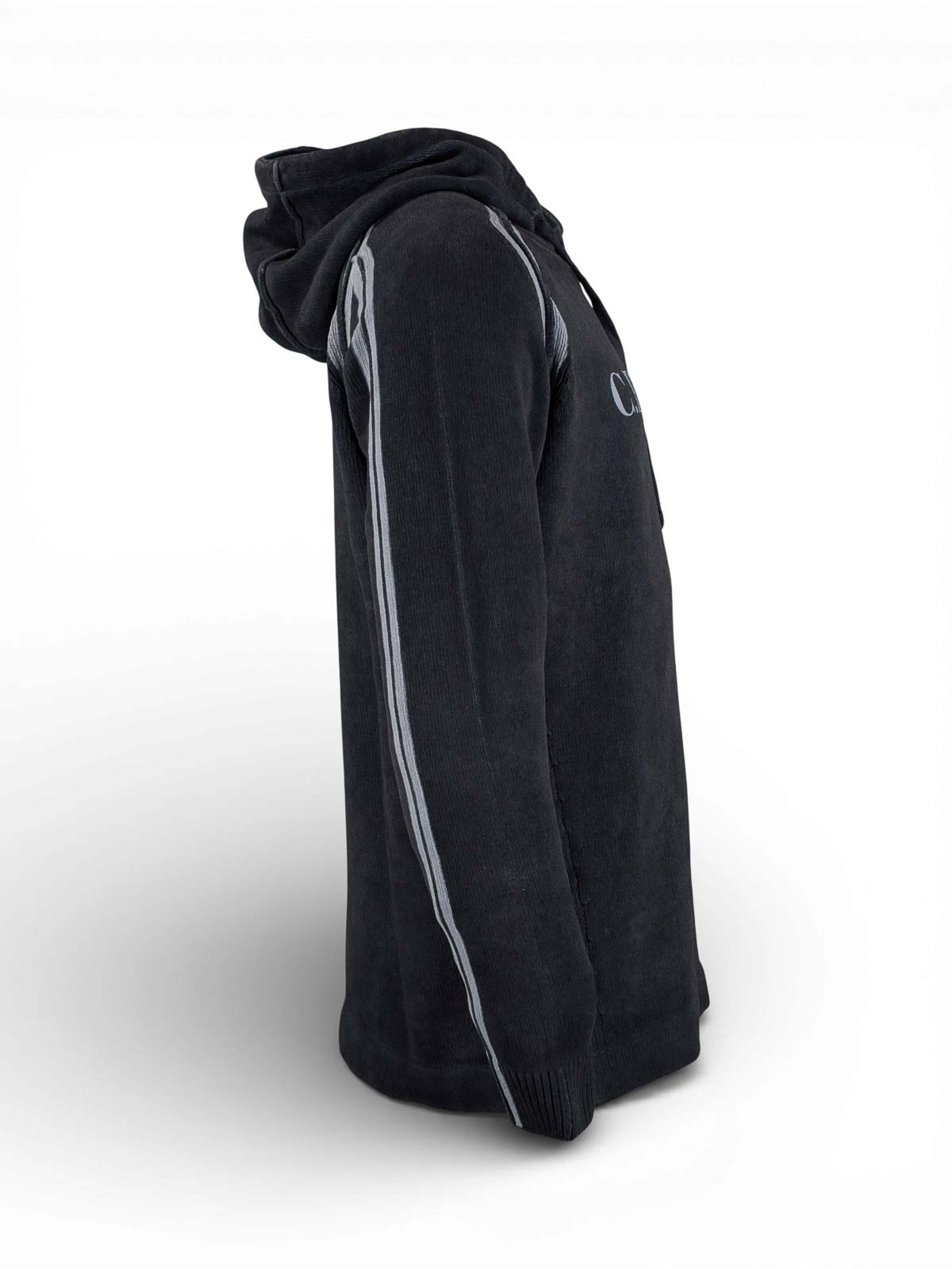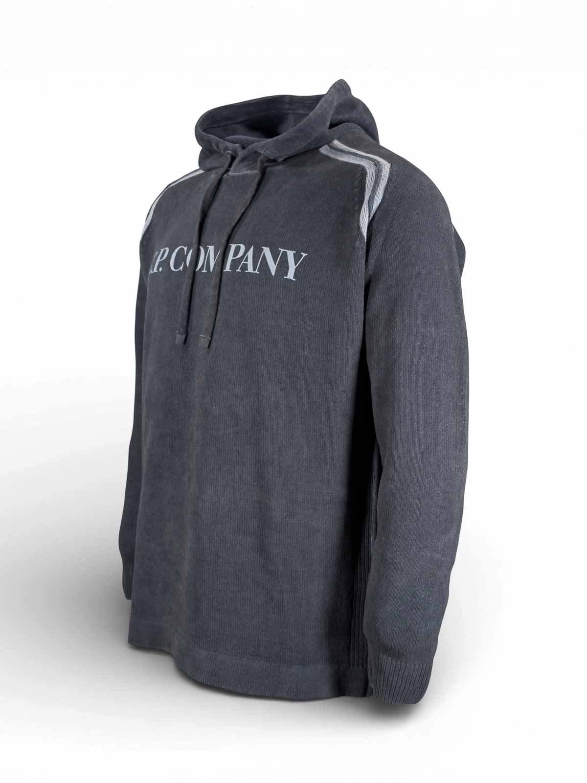 C.p. company, cotton chenille double dyed hooded sweater, midnight navy-blue, hooded sweater made of cotton chenille, characterized by a material construction and double garment dyeing that defines a distinctive striped effect. the model is worked with a 7 gauge and has a regular fit. The artisan dyeing process involves applying strips of fabric along the raglan sleeves and back seam before cold dyeing: the pigment does not penetrate the covered areas, generating lighter lines once the stripes are removed. the result, a chromatic contrast that enhances the structure of the garment. the design, completed by an adjustable hood with drawstring, contrasting stitching and logo printed on the chest. ribbed cuffs and hem for a defined fit., cotton chenille, adjustable hood with drawstring, contrasting stitching, logo printed on the chest, ribbed cuffs and hem, 7 gauge, double garment dyed, regular fit.