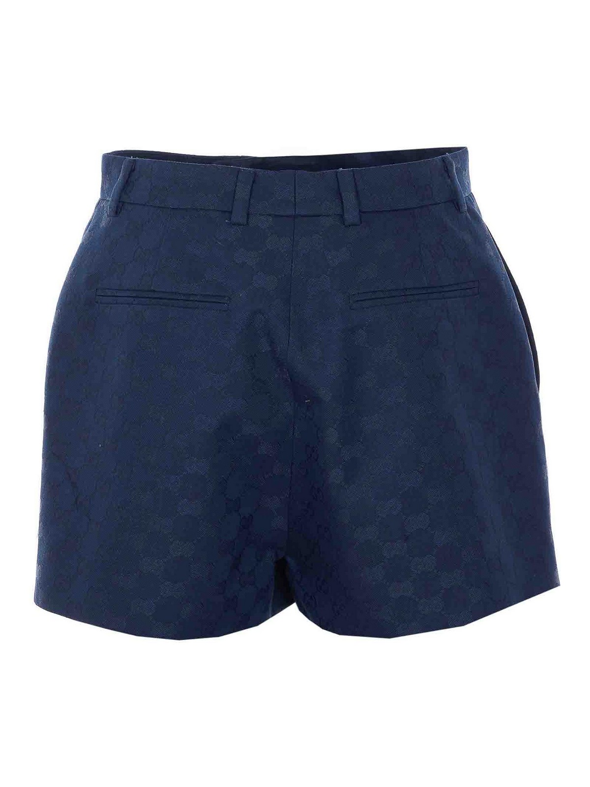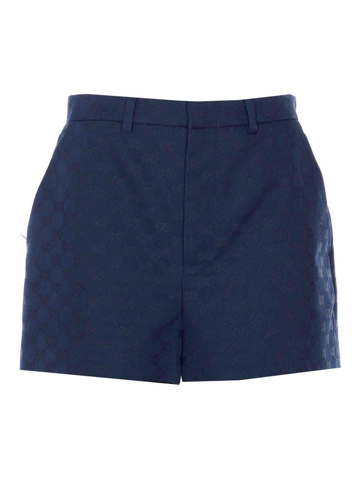 Gucci blue shorts, all over gg logo, zip, button and zip closure, lateral pockets