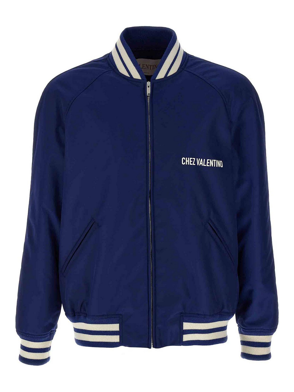 Lightly padded nylon bomber jacket with contrast knit details, 'chez valentino' print on the front and back, zip closure, pockets, long cuffed sleeves.