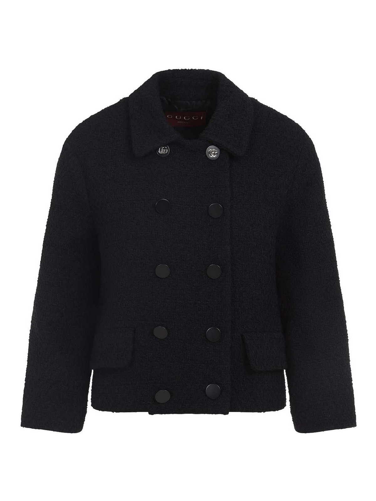Gucci boucle black jacket crafted from black boucle, blend shirt collar double, breasted with button two flap pockets long sleeves branded buttons at the cuffs straight hem lined
