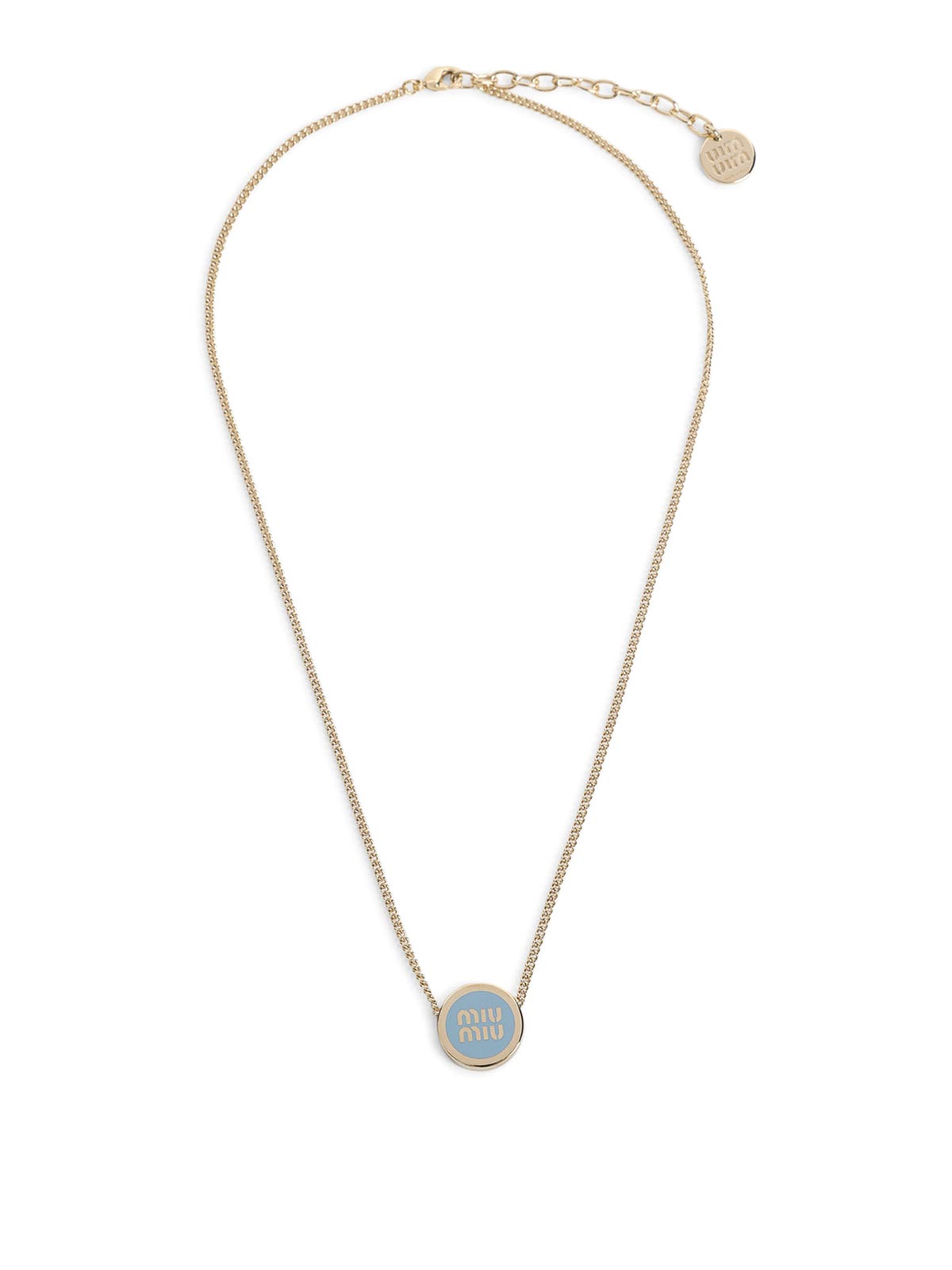 Miu miu celeste brass necklace. golden-finish brass, fine chain, celeste enameled round-shaped logo charm, adjustable fit, lobster claw claps closure, round charm with embossed logo at the back.